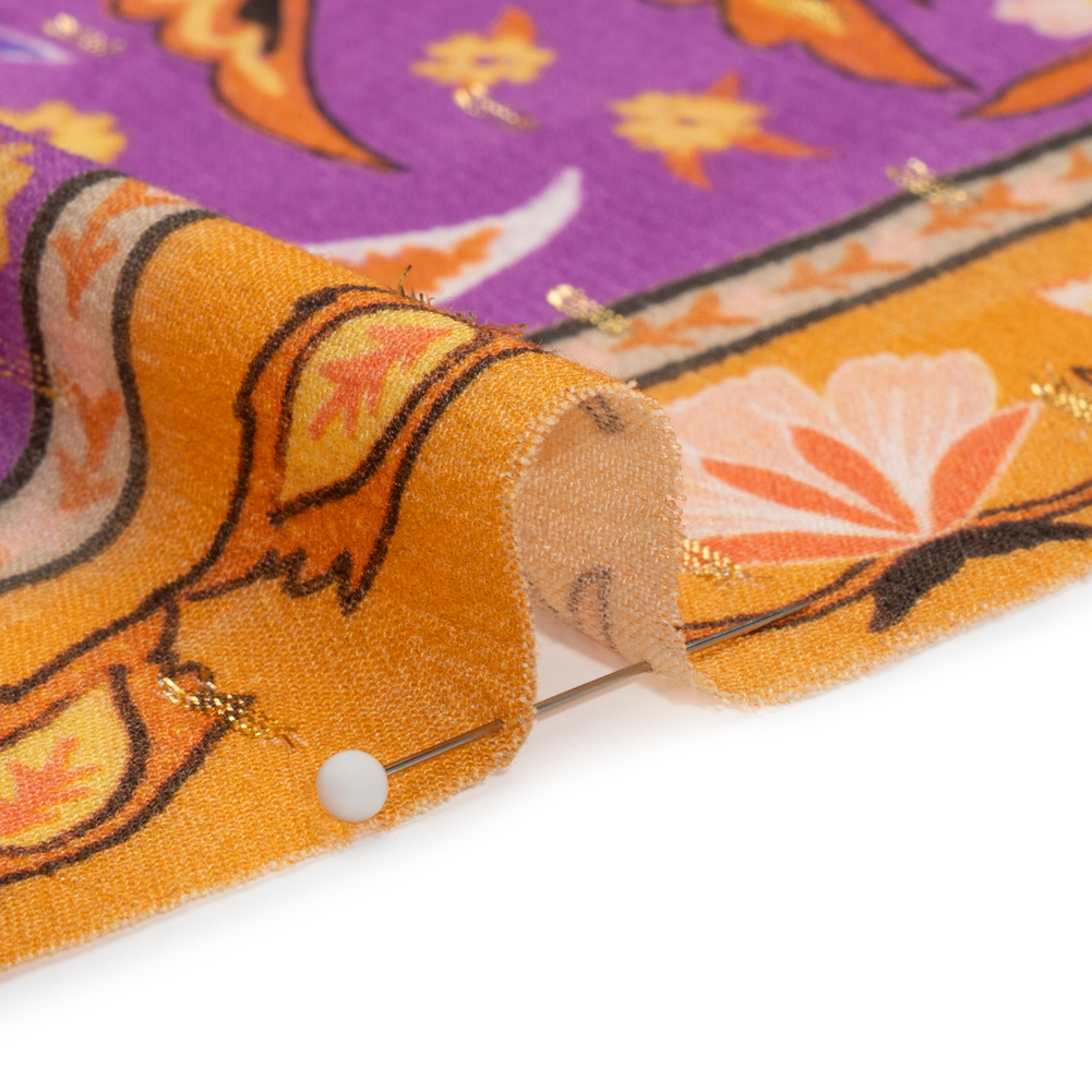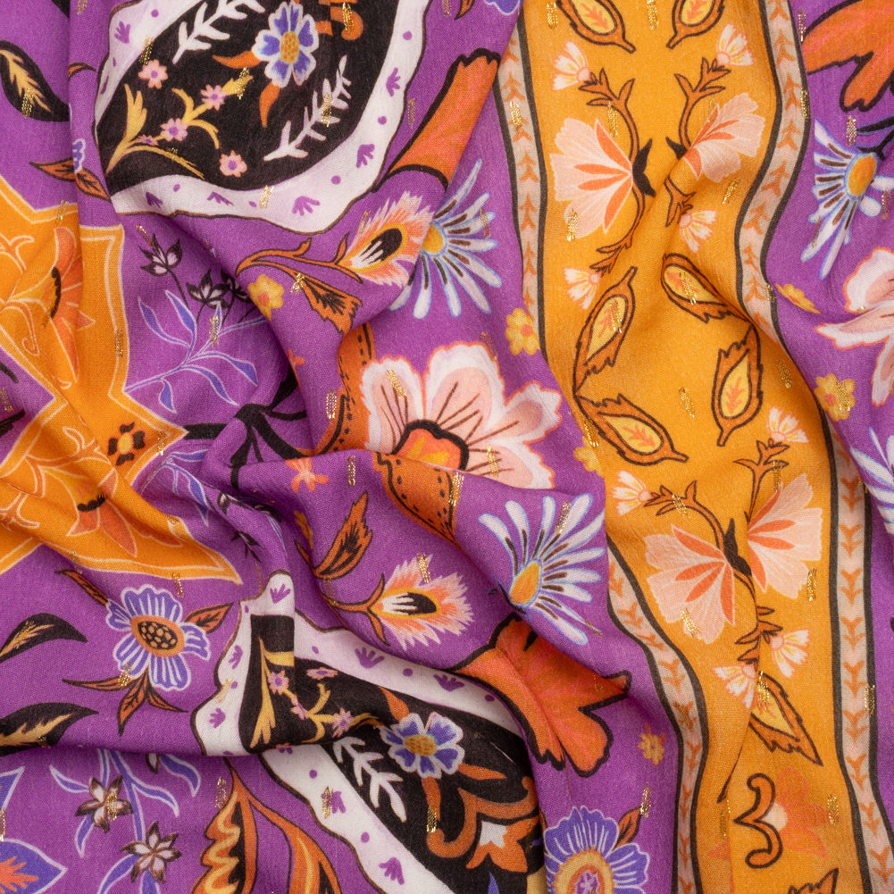 Our Mood Exclusive Purple Floral Facade Metallic Dotted Crinkled Viscose Crepe Panel is as sweet as orange marmalade and grape jam. Bordered by orange framing, magenta squares are landscaped with ornate leaves, petals, and flowers. The crinkled face, decorated with rows of metallic gold dots, displays the most distinguishable characteristics of a crepe: a grainy and crisp hand. A rippling drape compliments semi-casual silhouettes as its cool, medium-weight feel is perfect for all climates; create airy skirts, a-line sundresses, workday blouses, and more! Slightly transparent—a lining may be desired. Please Note: This panel measures 55" wide by 25" long.Here are a few tips from our sewists to master crepe’s unique texture:Lower the thread tension on your sewing machine to prevent puckeringUse a new, fine point needleTo prevent slipping during cutting, line up your pieces with the pattern pieces, cut in single layers, and use a rotary cutter or tabletop scissorsBe patient and have fun!