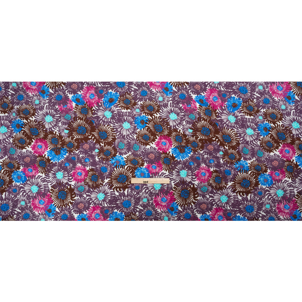 Close your eyes, make a wish, and blow on a dandelion—our Mood Exclusive Purple Wistful Weeds Striped Viscose Dobby has a field for you to pick from. Brown, blue, pink, and purple petals extend languidly as if they are caught in a breeze or in a tide, recalling images of anemones and dandelions. Created on a special loom, dobby fabrics feature small, woven details. Upon a close examination of this specific dobby, small lines can be seen running vertically across the lustrous face. Smooth in hand and fluid in drape, this fabric is luxurious for collared blouses, elegant dresses, flowy pants, and more. Please note that this lightweight fabric is translucent; a lining may be desired for complete opacity.