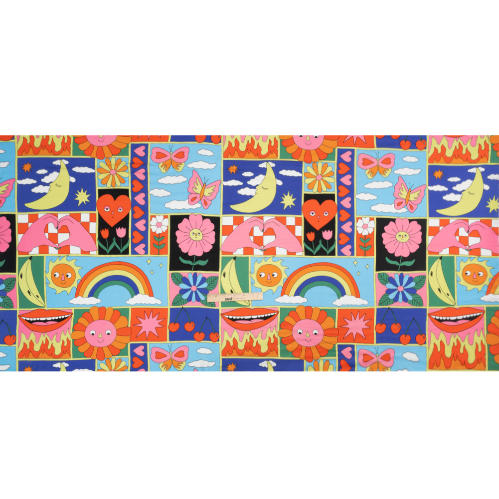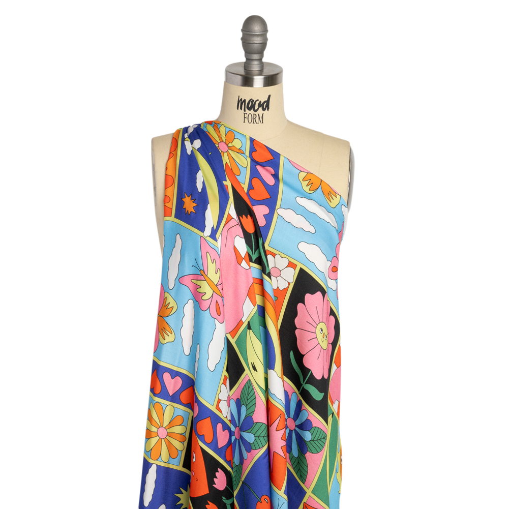 Trust yourself, the drowsy moon says. There’s joy everywhere, the smiling flowers whisper. Through the simplified art style often connected to comics and cartoons, our Mood Exclusive Red All Love Rayon Challis encourages your imagination to fall in love with the beautiful chaos that we call life. This fabric features a soft, sleek hand and a subtle luster. Demonstrate its lightweight, airy drape with maxi skirts, peplum blouses, and more. Challis is a plain weave fabric that has solidified its place in wardrobes since the Middle Ages. While the content of Challis has evolved from linen to cotton to now synthetic, its connection to elegance has not wavered. For the fashion students, home sewists, and designers, our professional sewists suggest to stay stitch necklines and curves before sewing, use a smaller stitch length on your machine, and finish with rolled hems or French seams. As it is slightly translucent, a lining may be desired.