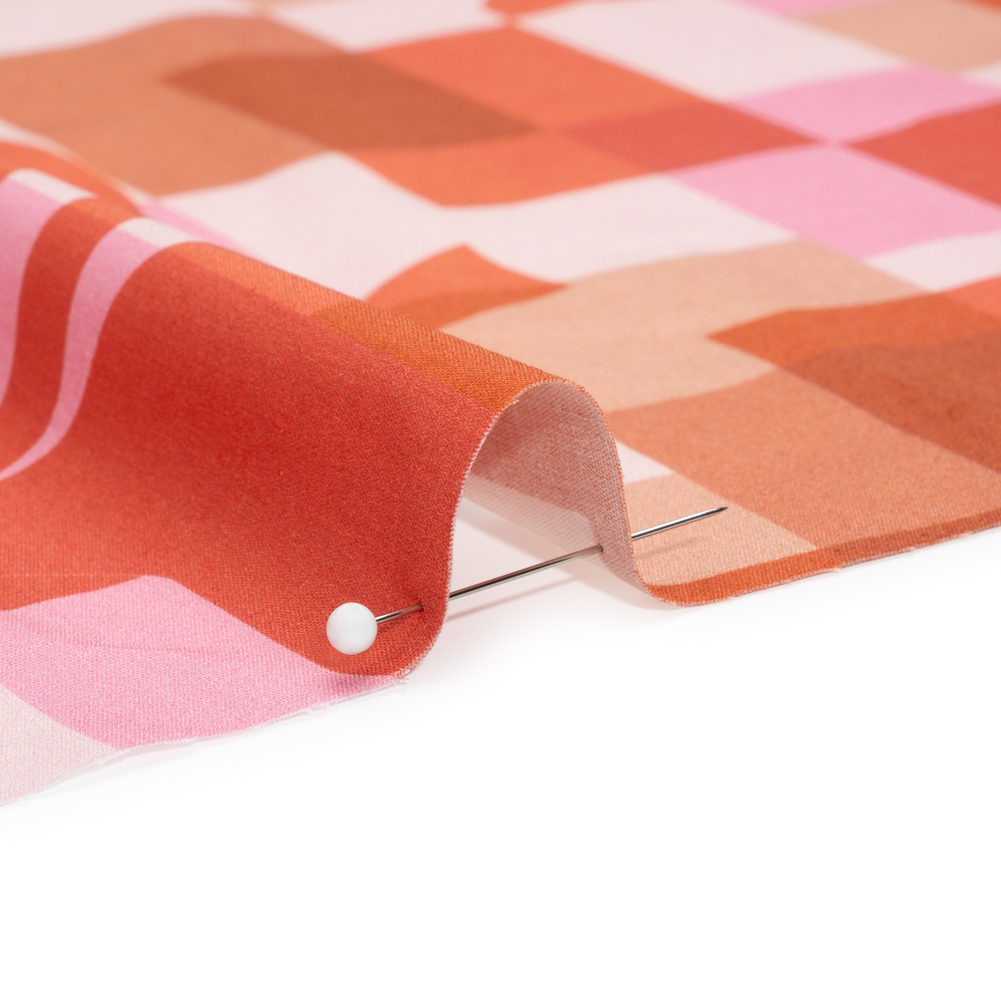A red fog descends on our Mood Exclusive Red Game of Haze Stretch Cotton Poplin, thick, murky... yet intriguing. A pink and red checkerboard sits idly in the haze, beckoning you in for another game. Owning a dry hand, this fabric falls with a crisp drape and features a 25% weft-wise stretch. As it is semi-translucent, a lining may be desired.Warm weather or cold, casual or semi-formal—cotton poplin lends a chic attitude to wardrobes, promoting clean silhouettes and elevated basics. The lightweight and cool feel is great for shirting; boxy cropped tops, button-ups, and shirt dresses are just the beginning of what you can create with this fabric!