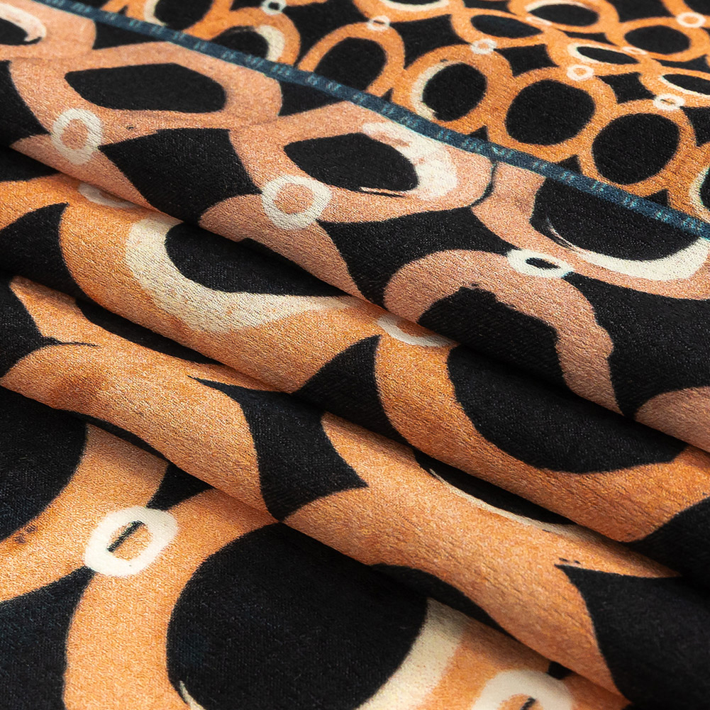 When wearing our Mood Exclusive Ring Light Polyester Crepe de Chine, make sure you’ve got the right lighting for all the social media posts you’ll take! Various squares feature rings of peach, navy, and white, popping against black, light blue, and peach ground respectively, as if illuminated by an outside source.