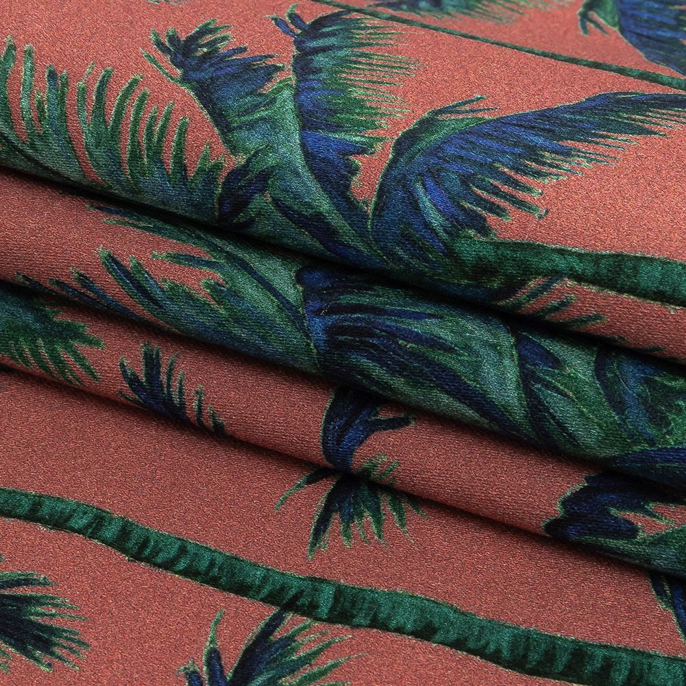 With luminescent blue-green leaves and green-tinted trunks, our Mood Exclusive Rose Psychedelic Palms Stretch Cotton Sateen is mesmerizingly unique.
