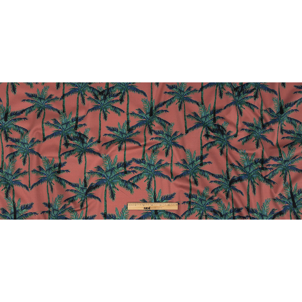 With luminescent blue-green leaves and green-tinted trunks, our Mood Exclusive Rose Psychedelic Palms Stretch Cotton Sateen is mesmerizingly unique. Set on a shimmering dusty rose pink ground, this fabric features artistic renditions of palm trees that grow in varying hypnotic shades of luminescent green and blue, as well as trunks with a mind-bending emerald green tint. This versatile sateen with a gorgeously subtle sheen offers incredible breathability and wrinkle resistance. Soft and smooth in hand, its medium weight composition offers a comfortable stretch through the weft. With a slightly stiffer, malleable drape, compose tailored sheath dresses, voluminous dirndl skirts, and off-the-shoulder blouses. Swing by our Mood Sewciety Blog to take a glance at our free Lantana Maxi Shirt, Daylily Skirt, Cypress Dress, Nepeta Blazer, Nymania Pants, Dogwood Ensemble and Ulmus Dress sewing patterns for more inspiration. Mostly opaque, the addition of a lining will be a matter of personal preference.