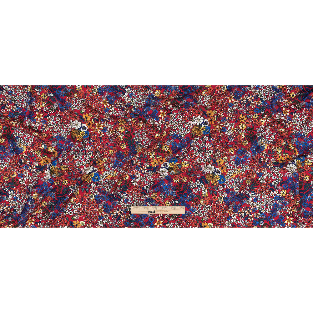 Rubies are a girl's best friend. Our Mood Exclusive Ruby Pink Abounding Blossoms Viscose Twill features a deeply vibrant red-ish pink backdrop that is home to a hand-sketched floral pattern in lively hues of golden yellow, deep blue-ish purple, and blue-ish white. A soft, smooth hand combines with a fluid drape to create this stunningly lightweight fabric. With a very slight stretch and a slightly translucent construction, a lining is recommended for full opacity. Perfect for warm weather months, create flowing blouses, wrap dresses, and playful shorts. Our Mood experts highly recommend using this viscose twill to fashion a cute summer skirt with a handkerchief hem.