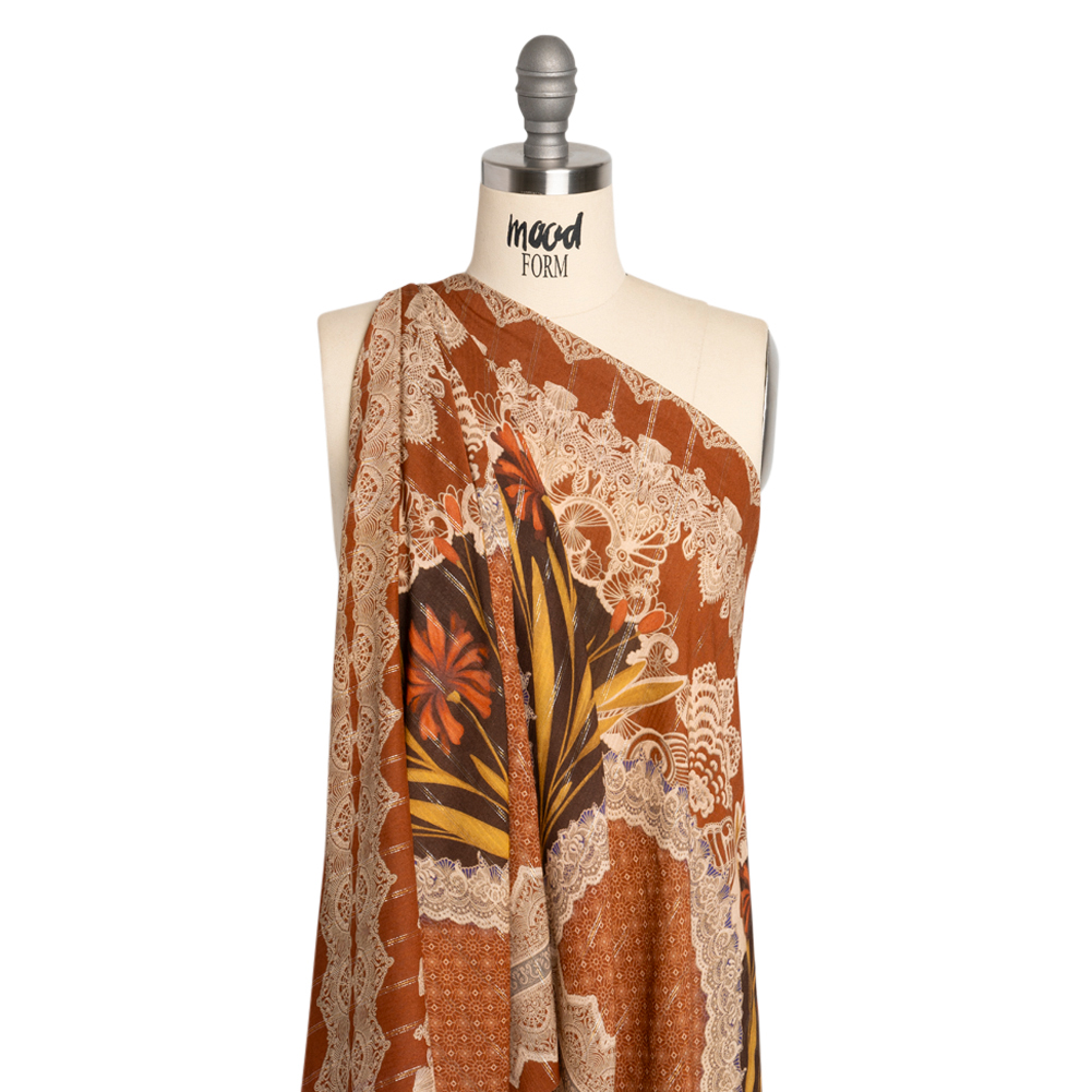 Our Mood Exclusive Russet My Happy Lace Metallic Pinstriped Viscose Dobby will become your happy place! Printed lace fans, archways, and ribbons match the elegance of the graceful maroon and red bouquets. Silver and gold metallic pinstripes electrify the reddish-brown face, elevating the tone-on-tone striping that is a characteristic of a dobby. It features a crisp hand and airy drape, perfect for lightweight blouses, sundresses, full skirts, and more! A lining may be desired to combat its transparency. Please note that this fabric is sold by the panel, measuring 59" by 25".