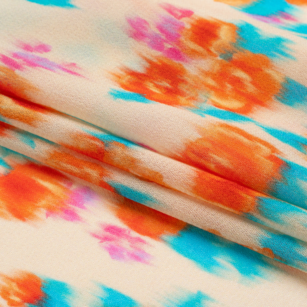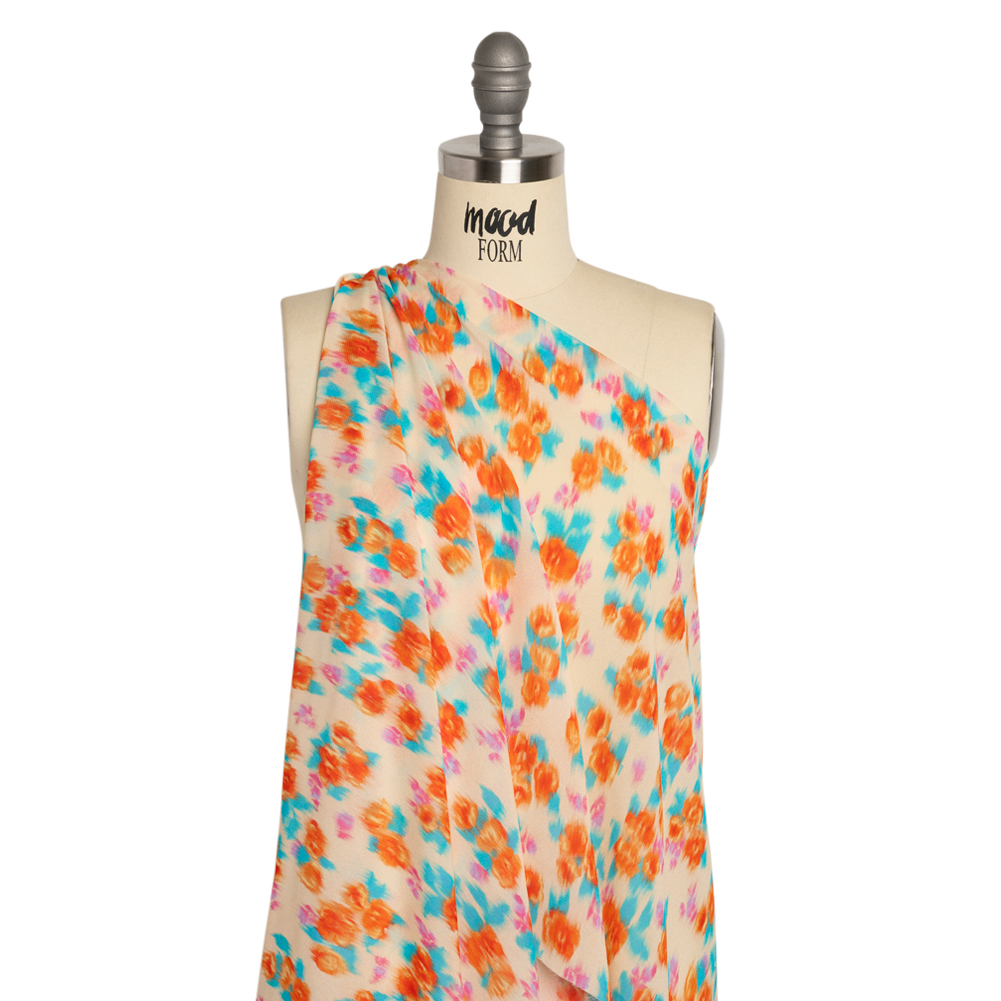 Memories of warm May days are blurred at the edges; they’re so full of excitement and action that you wonder if you ever gave yourself a moment to relax and smell the roses. Evoke this same vibrant energy with our Mood Exclusive Shades of May Viscose Georgette, painted in joyous summer tones. Grasp at blurry impressions of orange and pink flowers as they grow on blue leaves against a cream background. The crisp, pebbly feel is a characteristic of a georgette, bringing a visual intrigue to the face and a satisfying texture to the hand. Its billowing drape and translucent nature soften silhouettes and create an elegant feel, making it a perfect choice for an overlay on an evening gown or a workplace skirt. Add a lining to create gathered peasant blouses with sheer puffed sleeves and more!