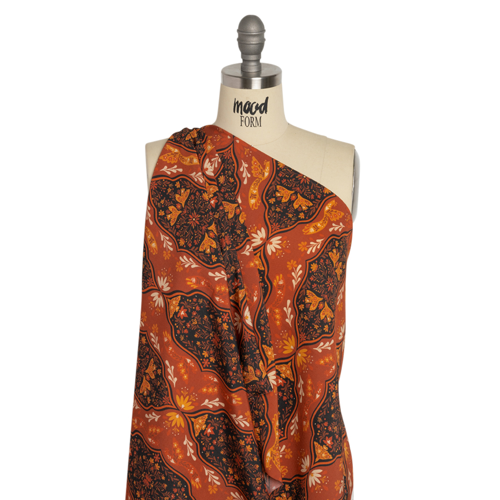 Orange birds blend in with the petals and leaves of our Mood Exclusive Smoulder and Soar Sustainable Viscose and Polyester Twill, decorating a maroon background and black medallions with a fiery conscience. An up-close-and-personal view shows the minute diagonal ribs characteristic of a twill weave, though texturally the face feels sleek and dry. The eco-friendly fiber blend creates a fluid drape and slight luster, perfect for airy dresses, lightweight blouses, lingerie, and more. Translucent; a lining may be desired for added opacity and structure.