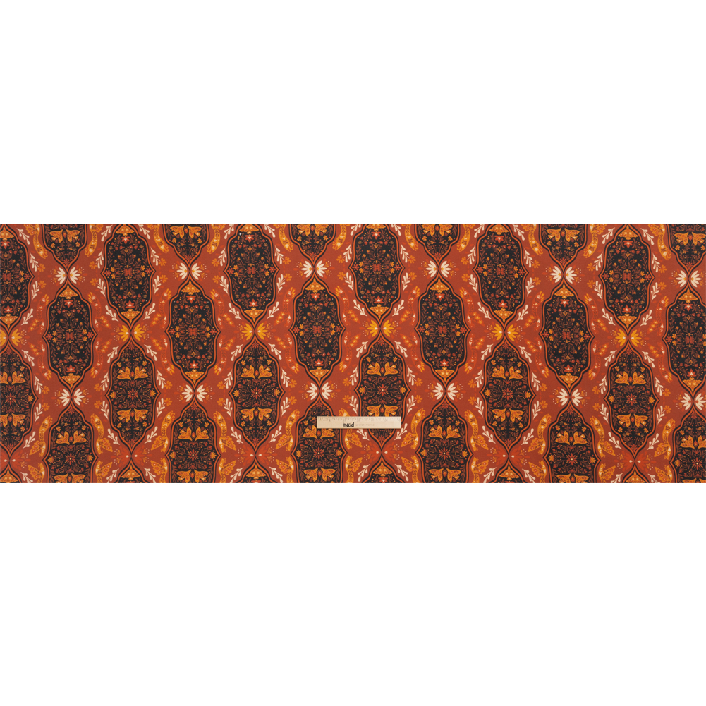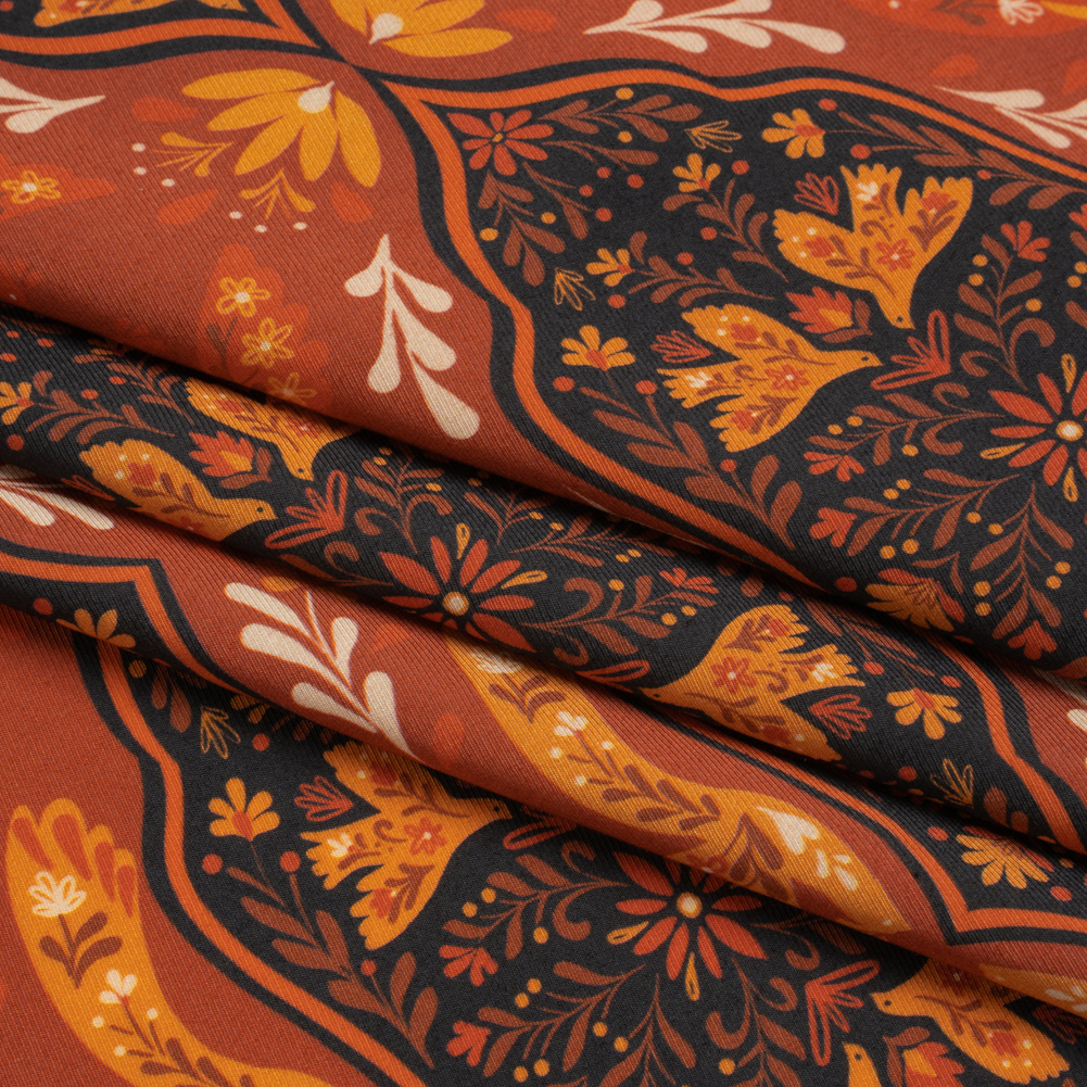 Orange birds blend in with the petals and leaves of our Mood Exclusive Smoulder and Soar Sustainable Viscose and Polyester Twill, decorating a maroon background and black medallions with a fiery conscience.