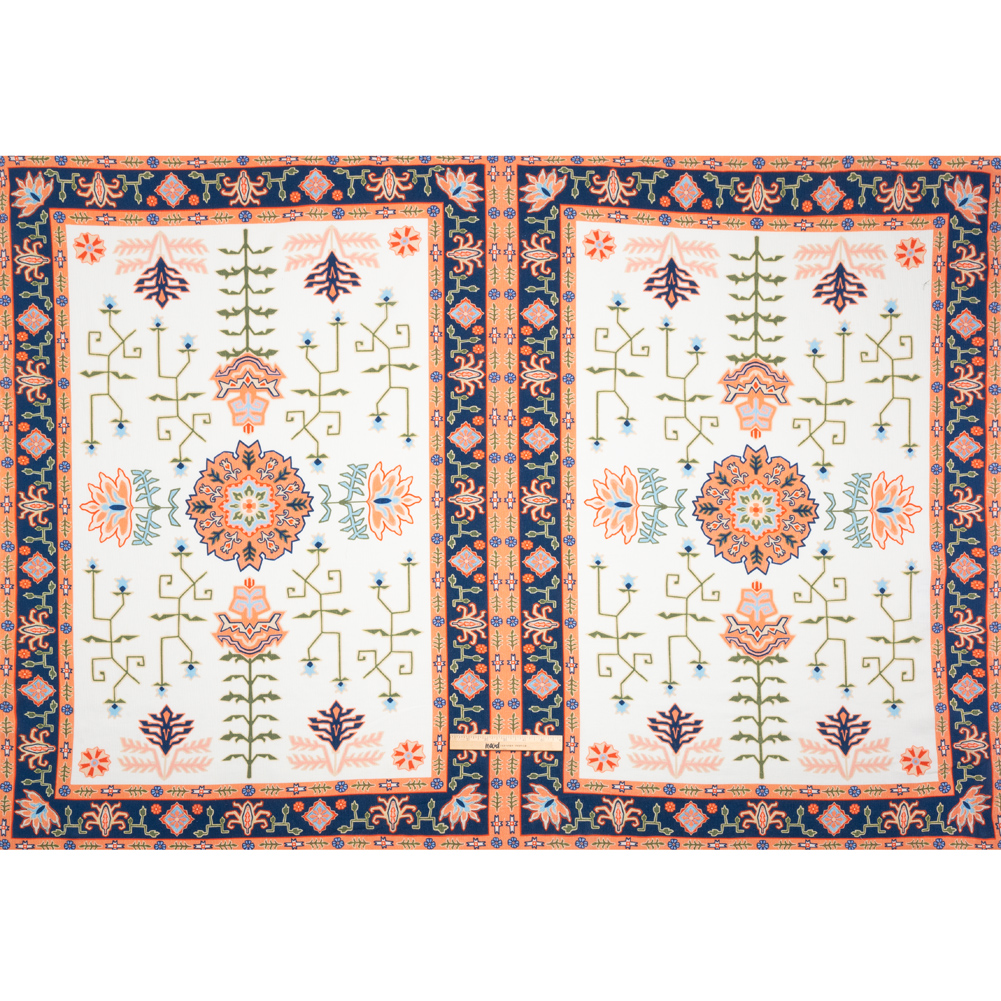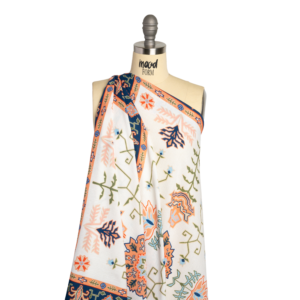 Geometric stylization joins natural motifs on our Mood Exclusive Sunny Simplicity Slubbed Gauzy Cotton Woven Panel for a simply stunning composition reminiscent of ancient art. In the center, flowers, stems, and leaves grow against a white background, while the deep blue and creamsicle orange borders hold yet more floral imagery. Easy-going energy is emitted from the gauzy hand and slubbed face, sitting cool against your skin even in the warmest of climates. Enhanced by a lightweight drape, this semi-sheer fabric brings a casual feel to wrap blouses, maxi skirts, and sundresses with ruffled sleeves! Depending on the project, a lining may be desired. Please Note: This panel measures 55" wide by 37" long.Please Note: The dye lot of this fabric has changed as of November 2025. If you had previously ordered this material, please order a swatch to ensure the new dye lot meets your color requirements.