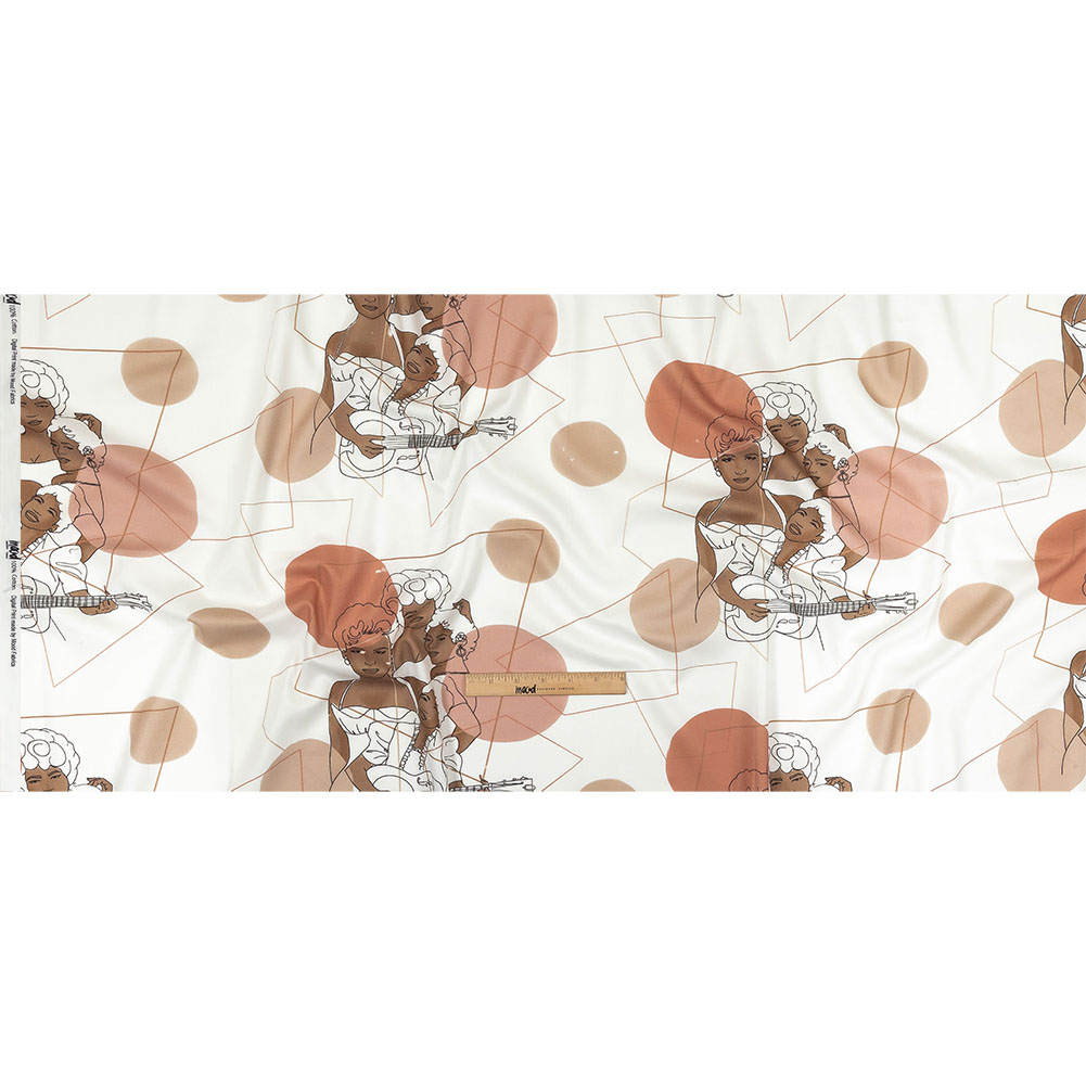 Designed by Mood Fabric's content designer Shavonne Cruz, this Mood Exclusive To Thelma, With Love Mercerized Organic Egyptian Cotton Voile is an homage to her late grandmother's love of music and fashion. Showcasing sketches inspired by pioneering Black musicians of the 1950s, this fabric celebrates love, family, and the music that has inspired generations. Mercerized cotton fabrics are far from your basic cotton fabrics, as they are finished with a special chemical treatment that increases luster, dye absorption, and tear strength while reducing fabric shrinkage. This crisp-handed cotton voile is elevated by a soft sheen. Thin and lightweight, turn this material into statement button-down shirts, structured or ruched blouses, and casual day dresses. Semi-sheer, a lining is suggested where full opacity and additional structure are desired.This eco-friendly product is STANDARD 100 by OEKO-TEX® certified; tested independently and worldwide, the certification system evaluates finished, semi-finished, and raw textiles while thoroughly covering chemicals, harmful substances, and precautionary parameters. Also recognized and certified by the BCI (Better Cotton Initiative), this product undoubtedly qualifies as eco-friendly for its sustainable sourcing; focusing on the exchange of good practices, it passes the economic, environmental, and social concerns of the initiative. MoodEarth Verified: For more information on Mood's sustainability initiatives, check out MoodEarth here.