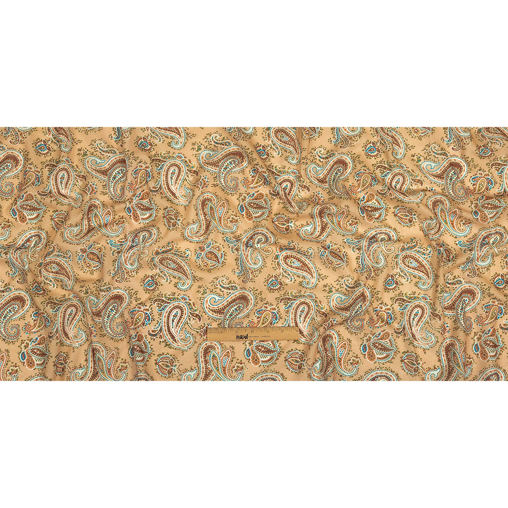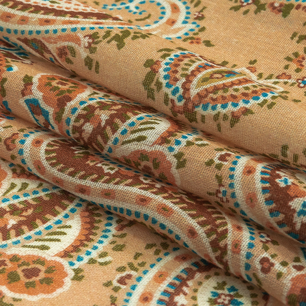 Change up your style and embrace flamboyant fashion in our Mood Exclusive Toasted Almond Peacock Revolution Cotton Gauze! An intricate paisley, composed of dots and brushstrokes in shades of peach, teal, and brown, pops over a toasted almond ground, reminiscent of 1960’s menswear.