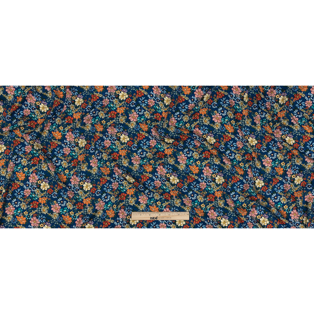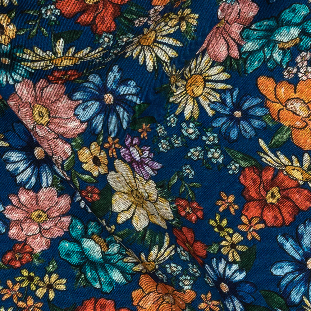 An explosion of flowers? Count us in! Our Mood Exclusive Twilight Blue Blossomed Detonation Viscose Twill features flowers in shades of orange, light pink, navy blue, and yellow that erupt across a deep blue sky.