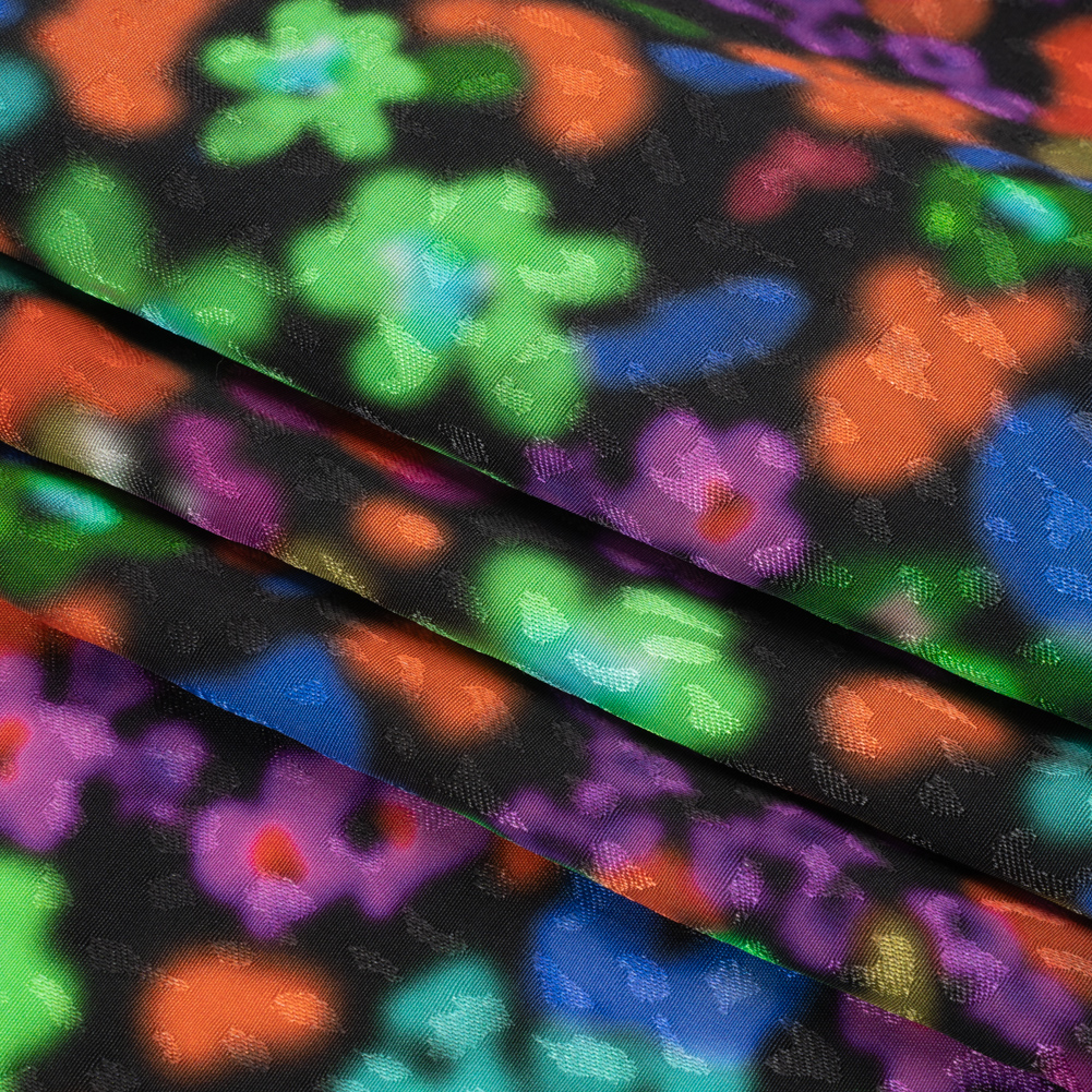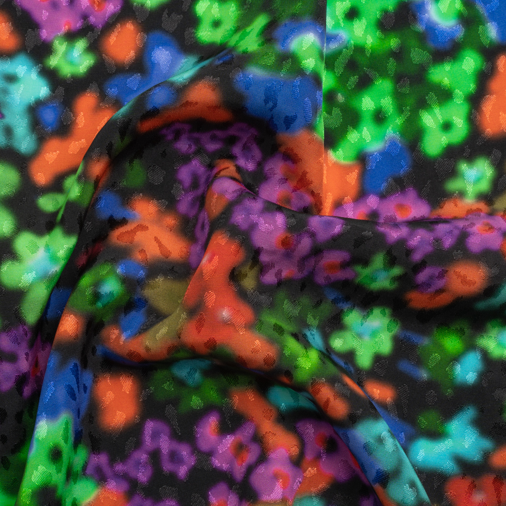 A floral field comes into focus on this Mood Exclusive Vermillion Electric Dreamscape Sustainable Viscose Jacquard, flashing the neon green, blue, red, and purple flowers of your wildest dreams.