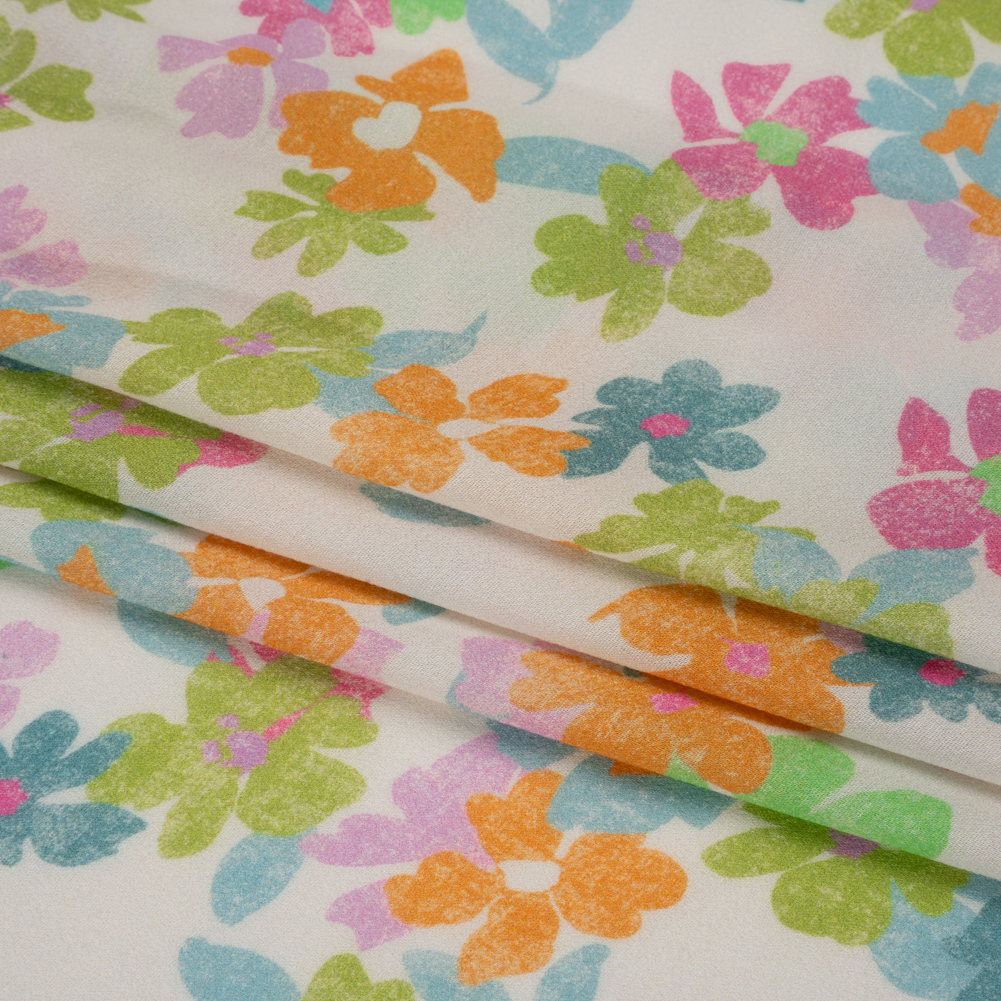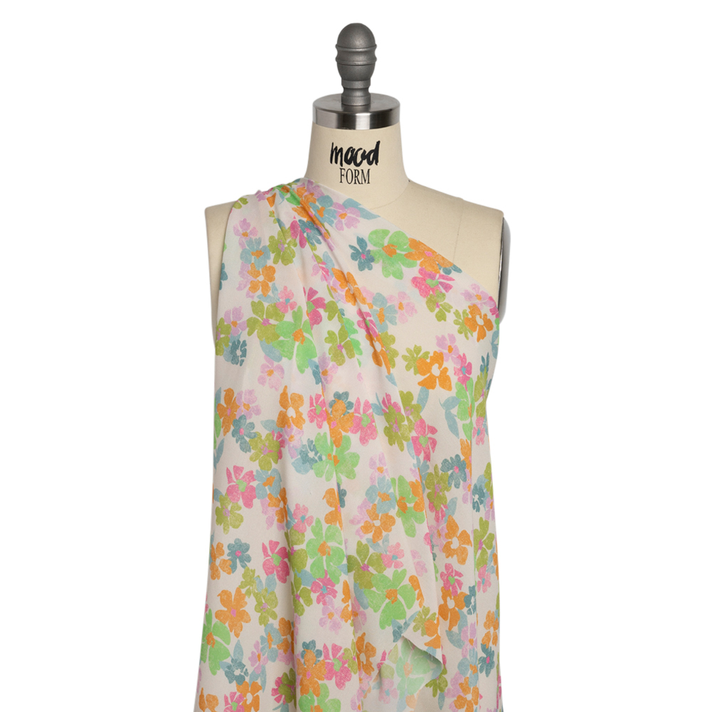 Can you hear it? The flowers on our Mood Exclusive White Flirt with Flowers Viscose Georgette are whispering sweet nothings! Green, orange, blue, and purple flowers look like they've been stamped onto a cream background. Georgettes are sheer, lightweight fabrics that create ethereal silhouettes. This specific georgette is made entirely of viscose, yielding a pebbly hand and an airy drape. From accessories to garments, create scarves, blouses, sarongs, and dresses (with or without a lining!).