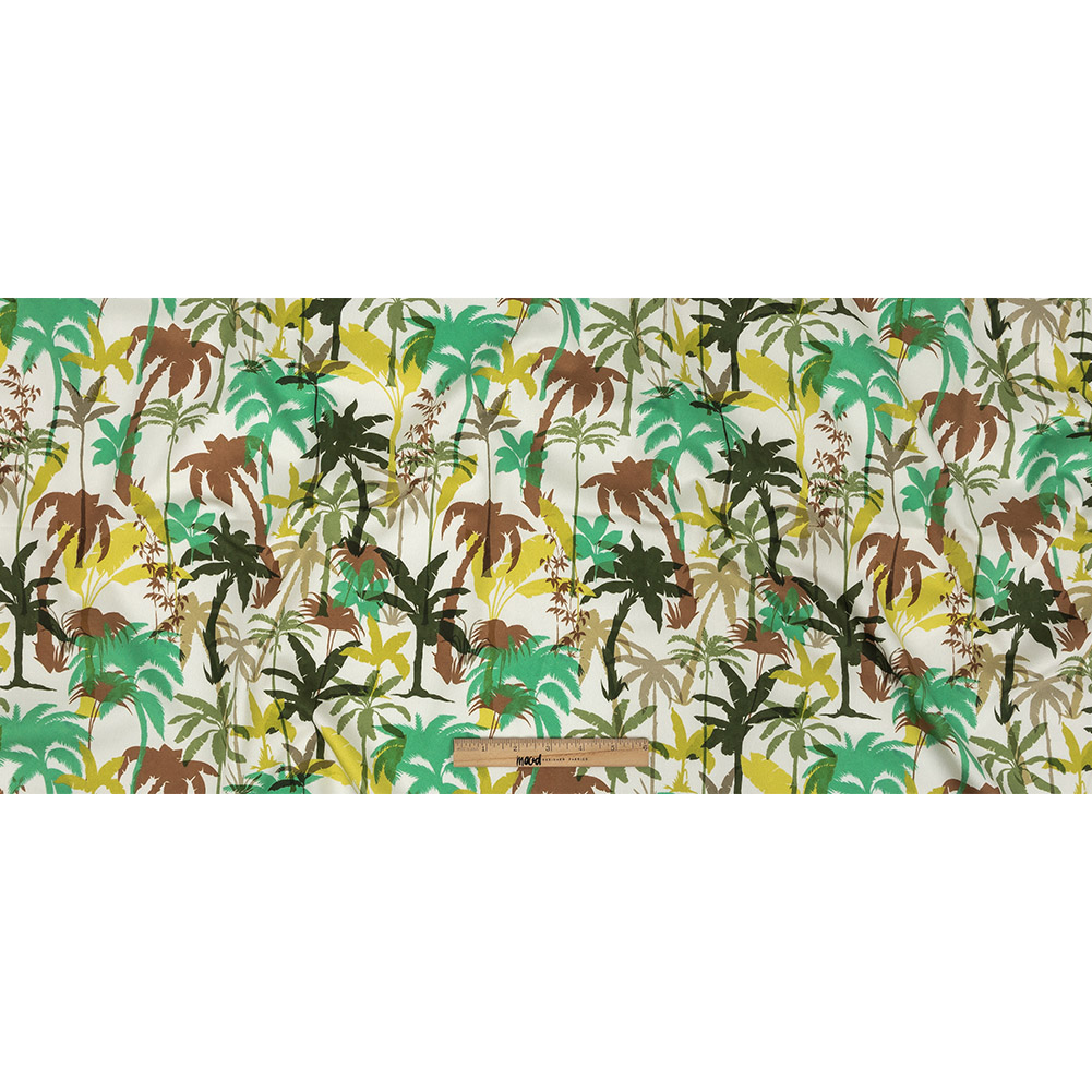 Wear the balmy trees of paradise everyday with our Mood Exclusive White Paradise Palms Stretch Cotton Sateen, which features overlapping palm trees in tropical shades of lime yellow, bright teal, deep hunter green, soft moss green, light coco brown, and warm beige, all of which sprout against a slightly off-white backdrop.