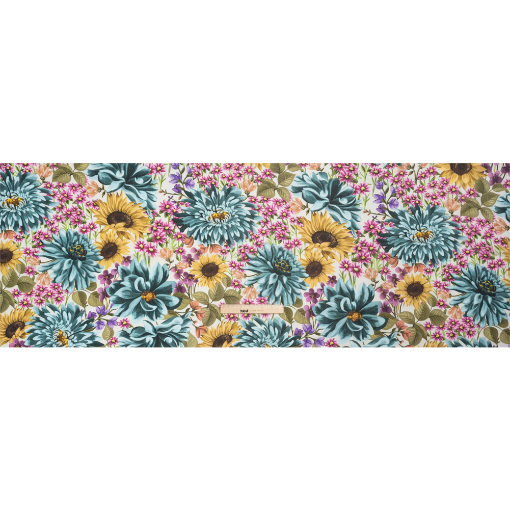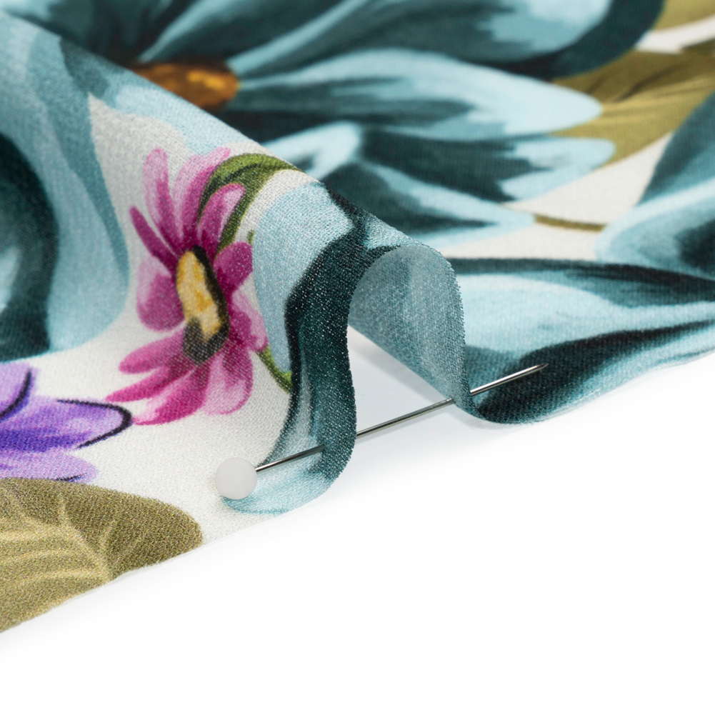 The spring air pulls you into nature, tempting you to run barefoot through our Mood Exclusive White Sightly Saunters Viscose Georgette. A meadow of large blue, pink, yellow, and purple flowers sprawls over a white background, textured by a crisp, grainy hand. Matte and translucent, this fabric is beautiful as an overlay, a stand-alone sheer garment, or with a lining.From weddings to brunches, cold weather to warm, georgettes cast an ethereal aura over semi-casual and formal occasions. Ideal for layering, pleating, and accentuating your figure, their airy drape inspires romantic gowns, workplace dresses, flowing pants, scarves, and more!