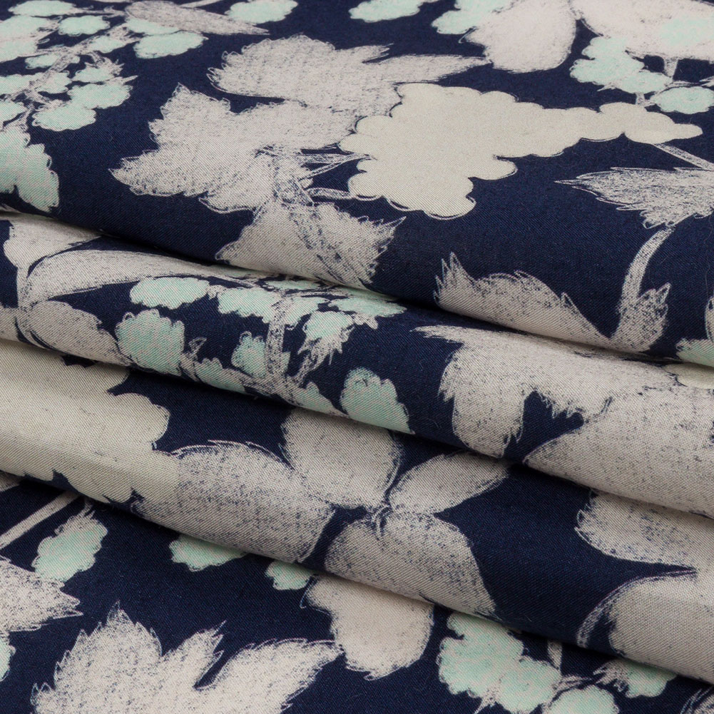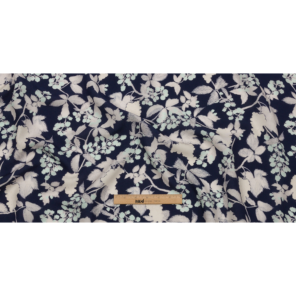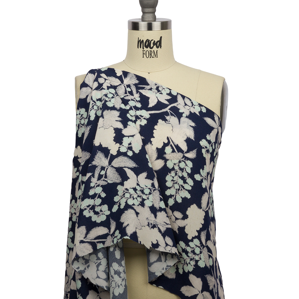 The delicacy of green leaves in the crisp winter air is snatched away by a coating of ice and snow, leaving empty silhouettes against the night sky on our Mood Exclusive Winter's Forgotten Viscose Woven. The impression of leaves, flowers, and berries is left behind in softly sketched outlines, all in white and palest green against a navy ground. Soft and lightweight, this viscose woven is ideal for all levels of sewists, providing unmatched fluidity and an enviably smooth, comfy wear. Try lightweight dusters ideal for layering, billowing maxi dresses, or sweet, yet sensual crop tops. Slightly translucent, a lining may be added for additional structure but isn't needed.