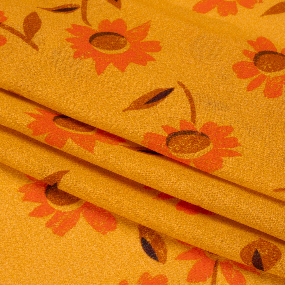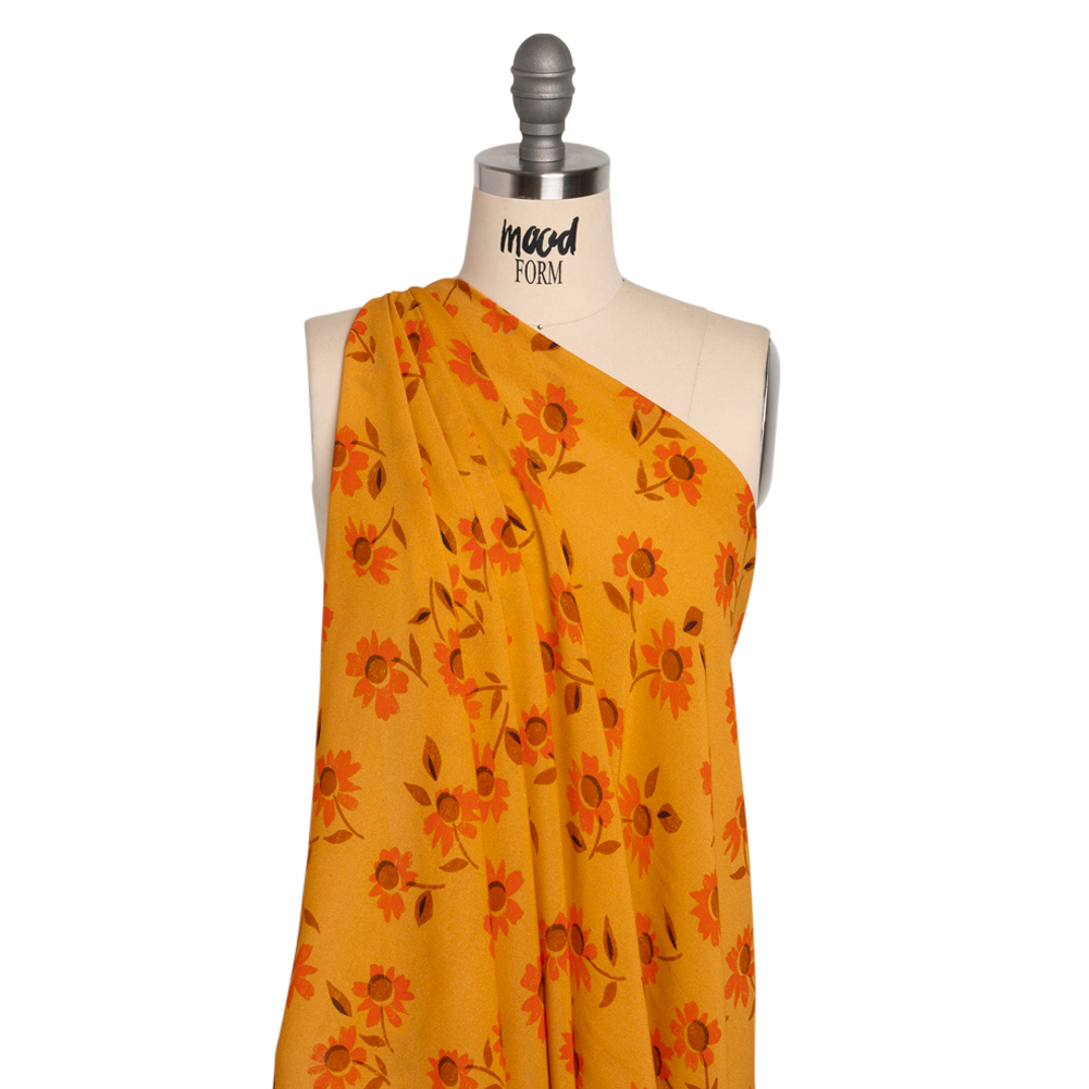 We hold our Mood Exclusive Yellow Ochre Dear Dahlia Viscose Georgette near and dear to our hearts! Orange petals sprout from brown leaves against a burnt orange background. Georgettes are sheer, lightweight fabrics that create ethereal silhouettes. This specific georgette is made entirely of viscose, yielding a pebbly hand and an airy drape. From accessories to garments, create scarves, blouses, sarongs, and dresses (with or without a lining!).