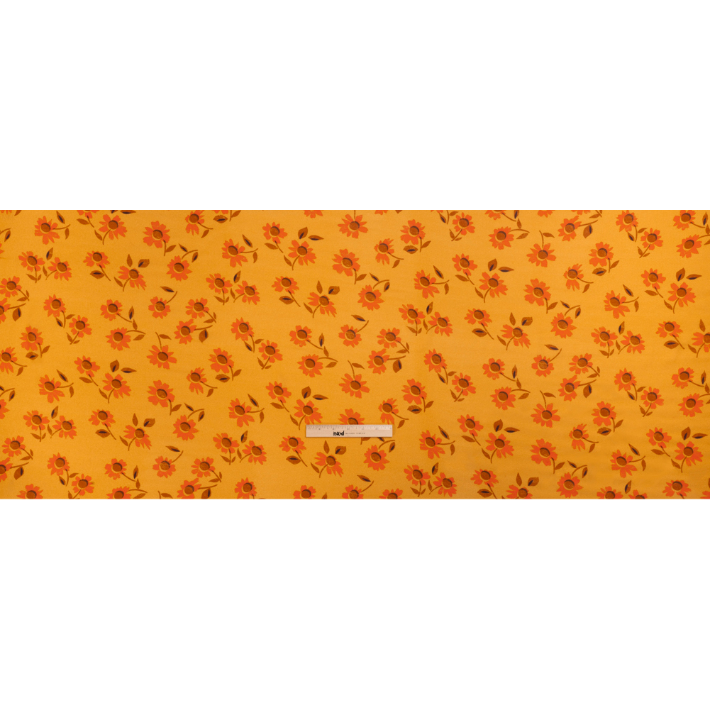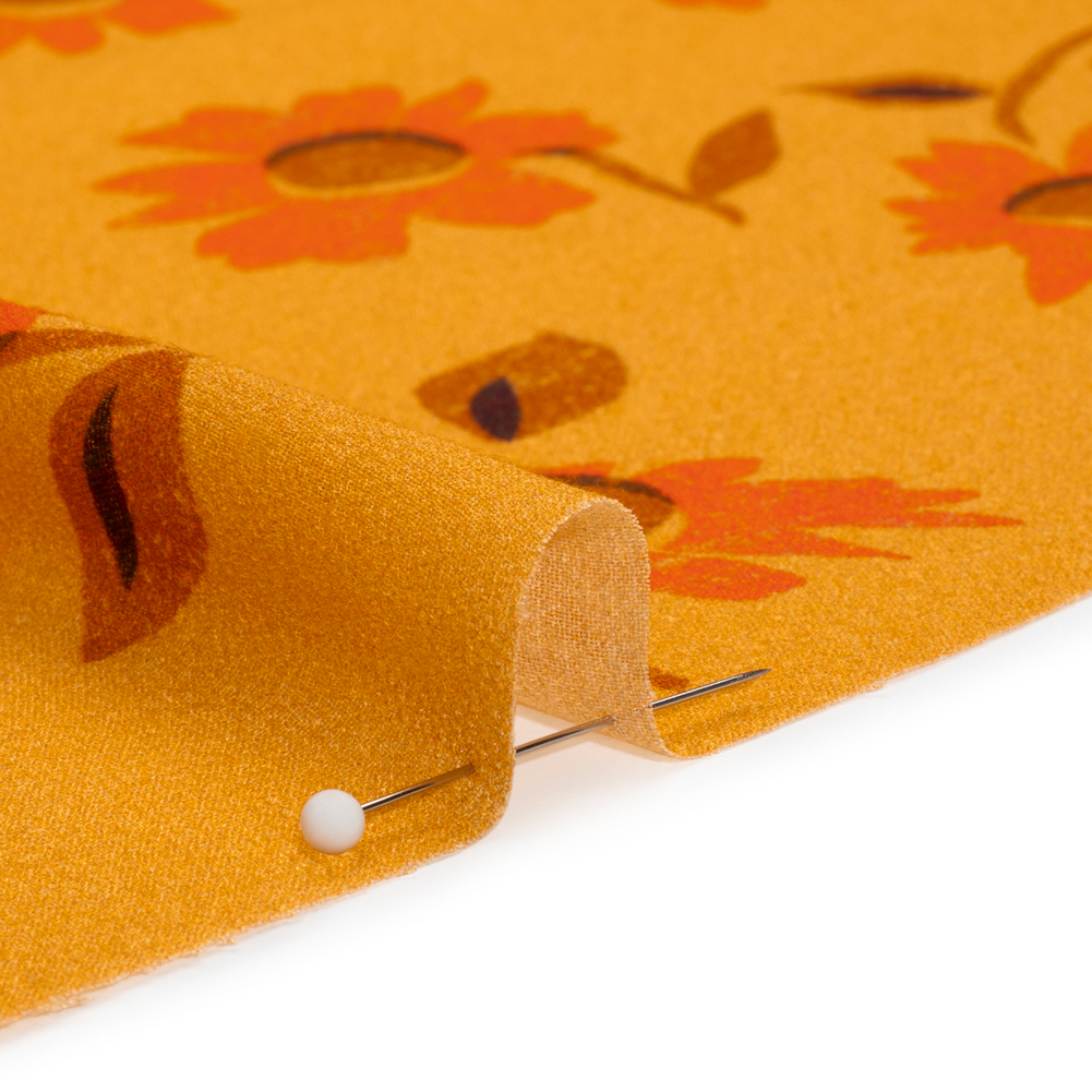 We hold our Mood Exclusive Yellow Ochre Dear Dahlia Viscose Georgette near and dear to our hearts! Orange petals sprout from brown leaves against a burnt orange background.