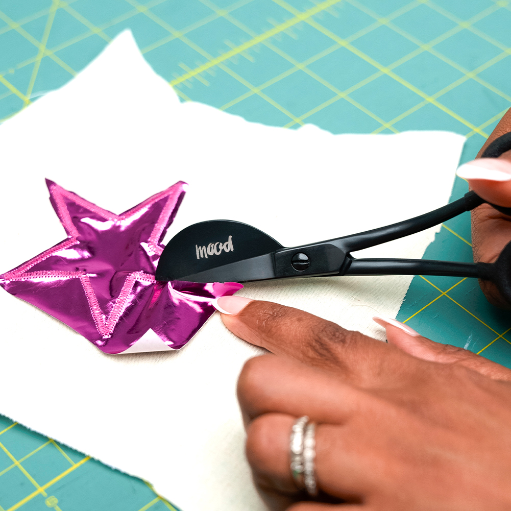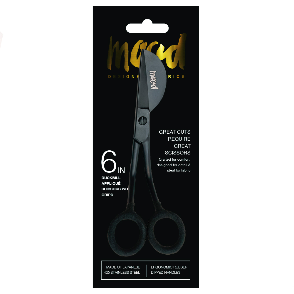 For precision between layers of fabric, our premium Mood-branded Matte Black Duckbill Appliqué Scissors with Matte Rubber Grips are an unbeatable choice.