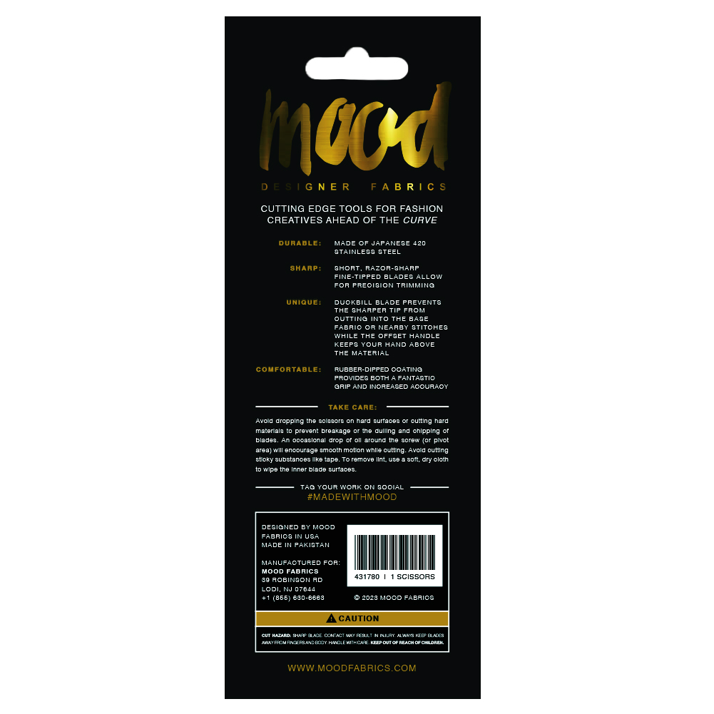 For precision between layers of fabric, our premium Mood-branded Matte Black Duckbill Appliqué Scissors with Matte Rubber Grips are an unbeatable choice. Composed of Japanese 420 stainless steel for undeniable durability, these gorgeous 6-inch scissors come in a luxe matte black finish with the Mood logo on both sides. Duckbill scissors provide a unique shape with one wide, flat blade and one narrow, tapered blade (both razor-sharp), plus an angled handle, that all together create the ideal cutting tool for appliqué techniques. The duckbill or paddle blade prevents the sharper tip from cutting into the base fabric or nearby stitches, while the offset handle keeps your hand above the material for effortless cutting.Additionally, these scissors are joined with a screw, so they can be adjusted or repaired if needed.For a final touch to make the perfect scissors, the handles feature a rubber-dipped coating that provides a fantastic grip while increasing accuracy, making them ideal for extended use!Available in both metallic blue and luxe matte black, these scissors are part of our premium collection of Mood Branded Scissors, where you’re sure to find the perfect cutting tool for every sewist, crafter, or designer in your life! WARNING: Cancer and Reproductive Harm - www.P65Warnings.ca.gov.