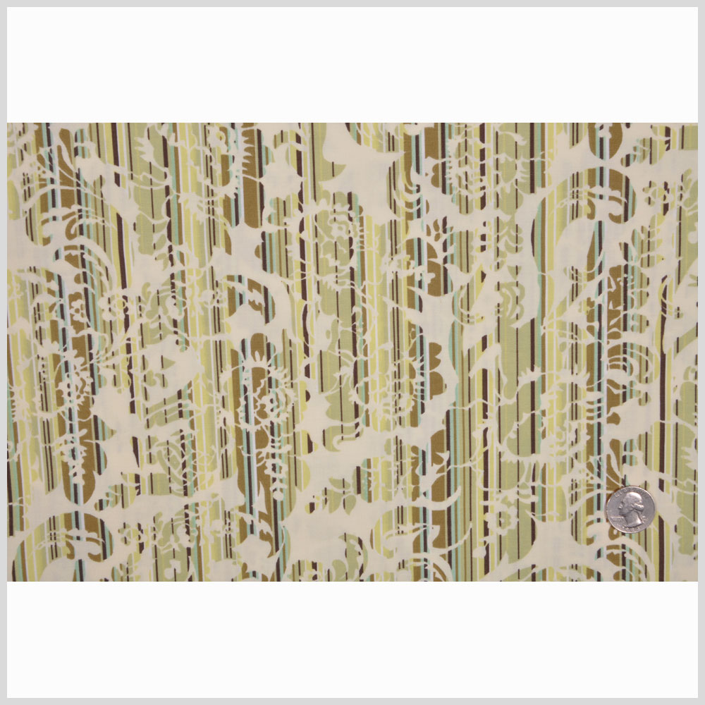 Muted green stripes sit below a beige floral silhouette pattern on eye-catching stretch cotton. Lightweight, it is a great fabric for jackets and skirts.