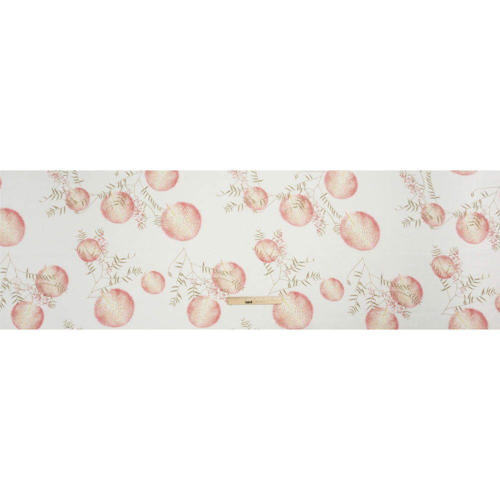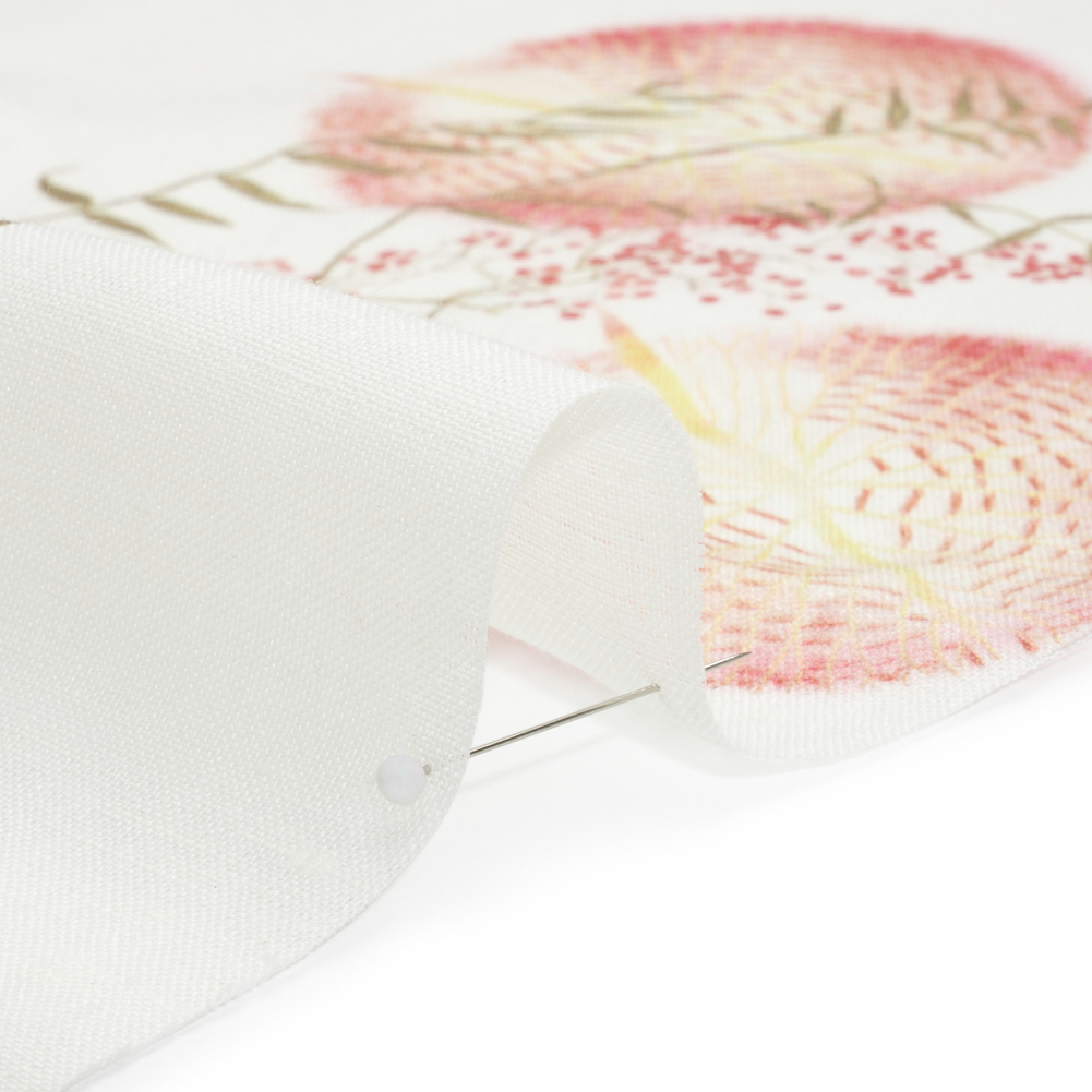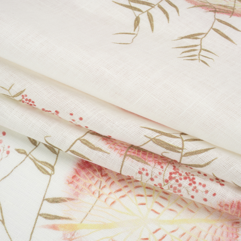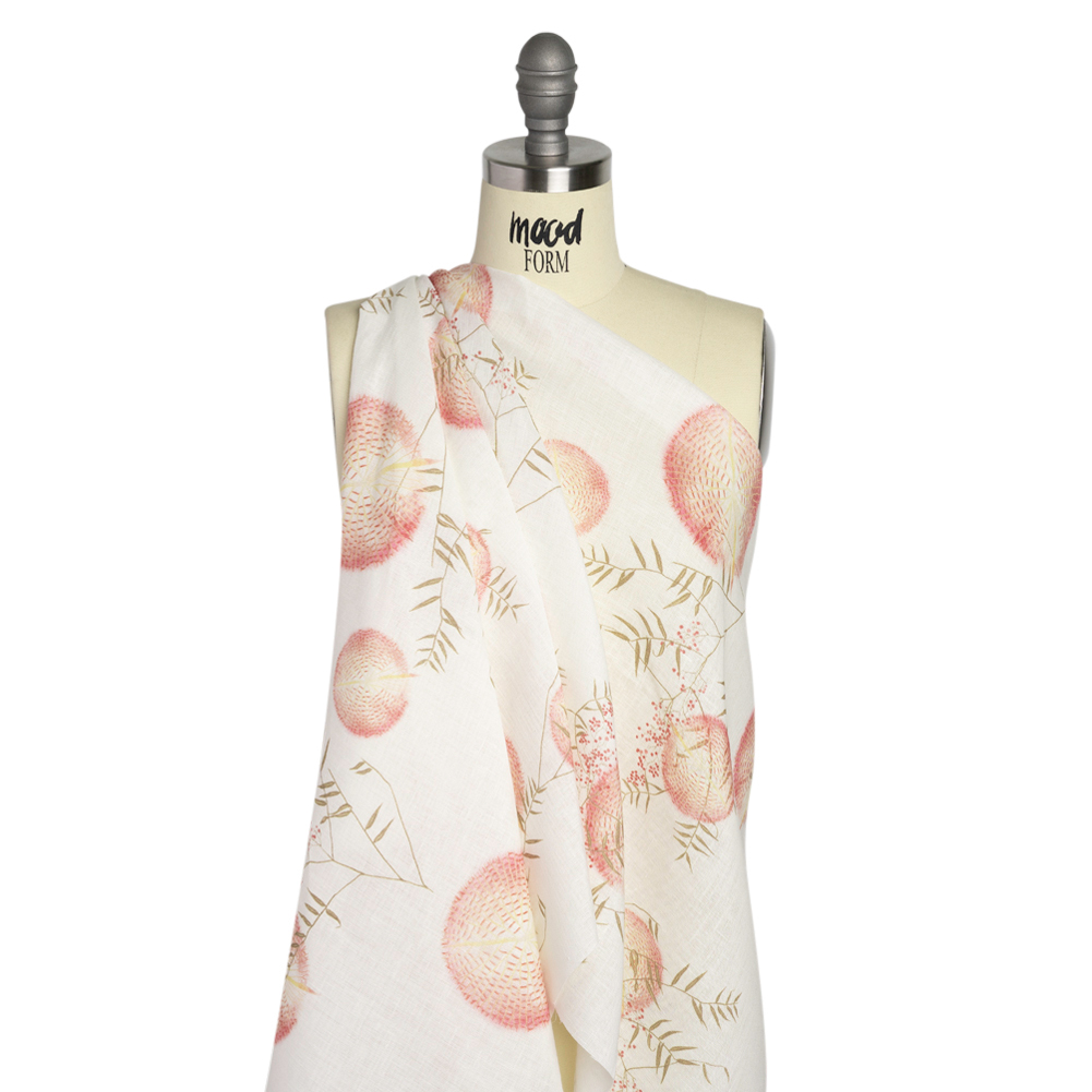 In burning hues like the setting summer sun, dandelions float like lanterns across this Muted Red, Yellow and Olive Sunny Puffballs Medium Weight Linen Woven. The white background hosts green sprigs and cranberry branches as well, painting a simple image of a warm summer evening. The slightly slubbed face yields a pebbled and cool hand, evoking the ease and organic feel characteristic of a 100% linen fabric. Naturally moisture-wicking and of medium weight, it will not cower from the heat—quick absorption of water allows for its supple drape to be worn comfortably as a blazer, wrap-around skirt, and paper bag pants in any climate. Slightly transparent, a lining may be desired for modesty purposes.