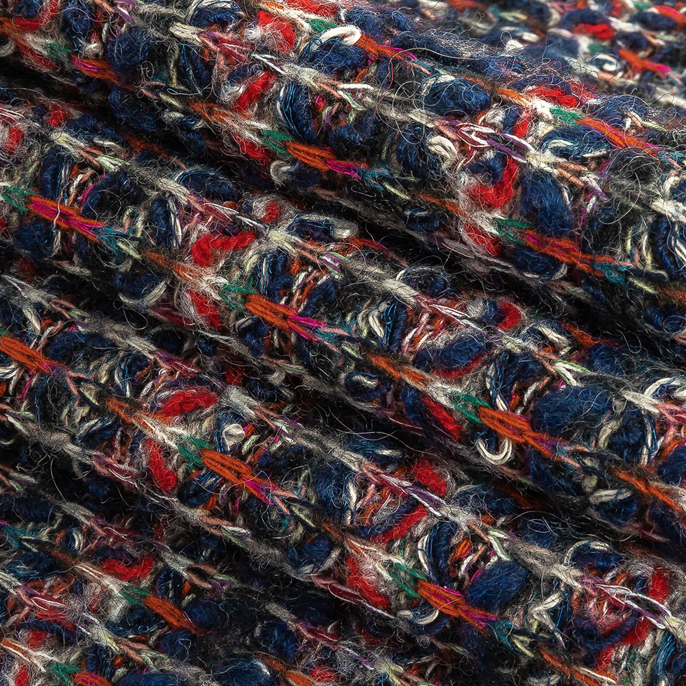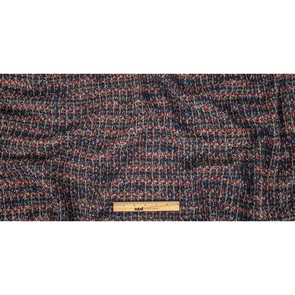 Our Navy and Red Striated Chunky Wool Knit combines stimulating texture and classic cold-weather colors in the best way imaginable. Highly textured in the style of your favorite movie-watching blanket and perfectly balanced by tight threads holding down excited boucled springs, this fabric presents a heavy but malleable drape. Craft cowl-collared sweaters, oversized turtlenecks, and statement vests that are sure to keep you both warm and stylish. This fabric has a slightly open construction that allows for some light and wind permeability, consider layering for added wind resistance and opacity.