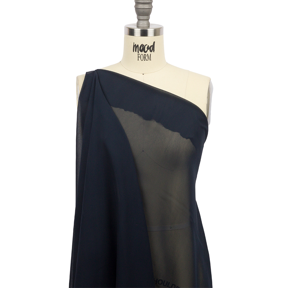 Flow into spectacular style with this Navy Blue Rayon Chiffon. Simple and classic, this navy blue material offers a crisp, grainy hand and fluid drape. Without stretch, create evening gowns, bridesmaid dresses, flowing blouses, and so much more. Sheer, add a lining where opacity is desired.