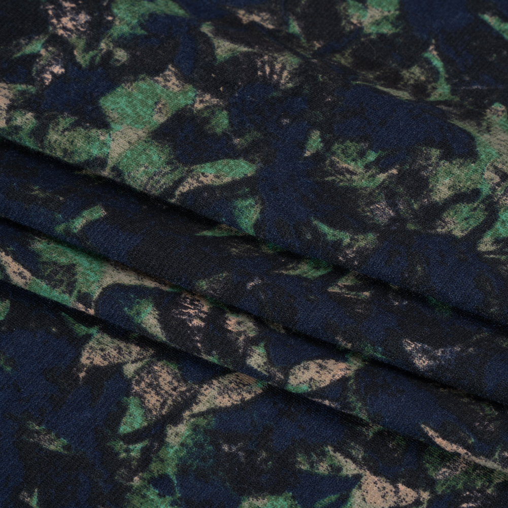 Navy, Green and Taupe Leaf Impressions Polyester Interlock Knit