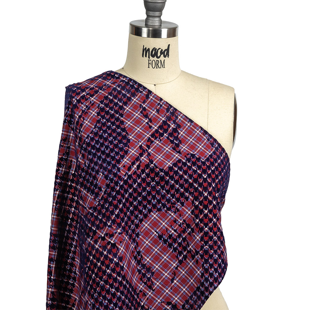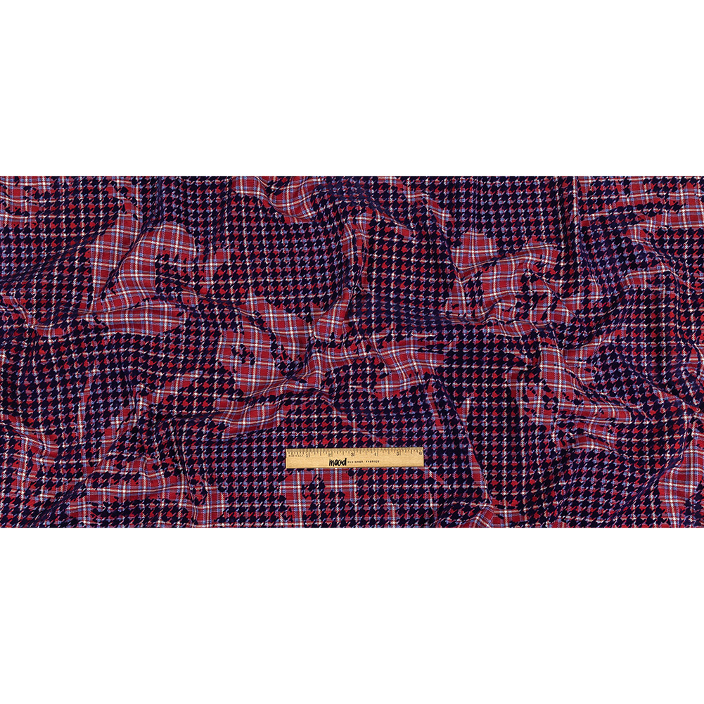 Navy, Red and White Negative Space Florals in Flocked Houndstooth on Plaid Rustic Cotton and Polyester Woven