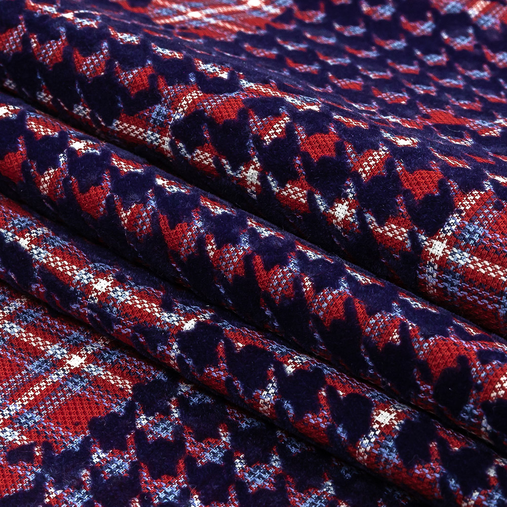 For a preppy twist on Americana, why not try our Negative Space Florals in Flocked Houndstooth on a Plaid Rustic Cotton and Polyester Woven? Truly a feast for the eyes, flocked navy fibers create a houndstooth pattern, with florals carved in the negative space, allowing the red, powder blue, and white plaid to pull focus. Not satisfied with just a captivating pattern, the combination of tactile, woven, and plush textiles is sure to make your hands happy! Crisp and structured, we suggest matching blazers and cigarette trousers, sheath dresses, or pencil skirts. Somewhat translucent, particularly with lighter shades, pair with a lining for additional structure and complete opacity, if desired.Please note: The repeat measurements are for the largest design on the fabric, and do not indicate the repeat of any smaller, additional designs.