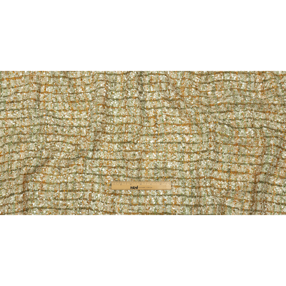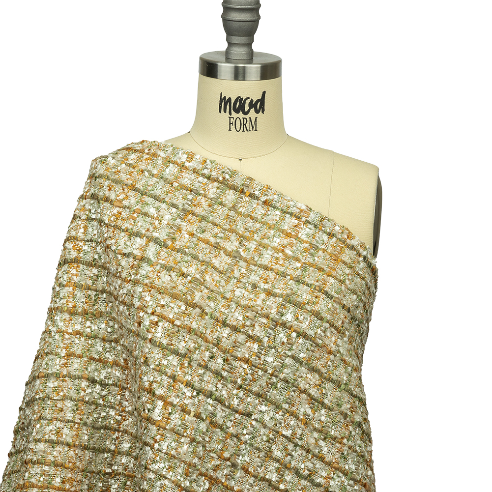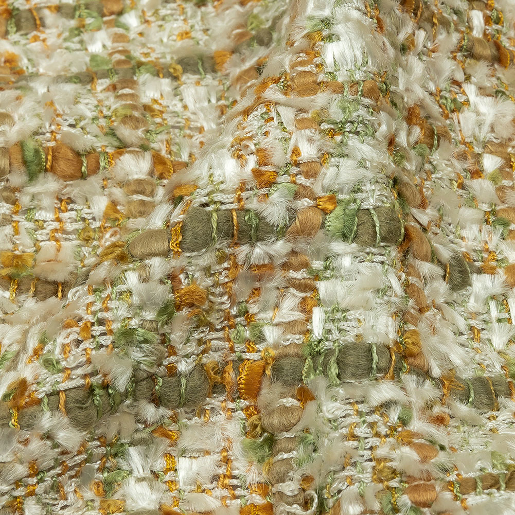For a subtle mix of neutrals and alluring color, explore this Newcastle Green, Mustard and Silver Birch Viscose and Acrylic Chenille Tweed! Sage, white, gold, and greige are interwoven creating a slightly fuzzy, tactile hand. The malleable drape allows you to create Chanel-inspired skirts, boxy jackets, dresses, peacoats, and more. Nearly opaque, a lining is only recommended for comfortability purposes and additional structure or stability when desired.