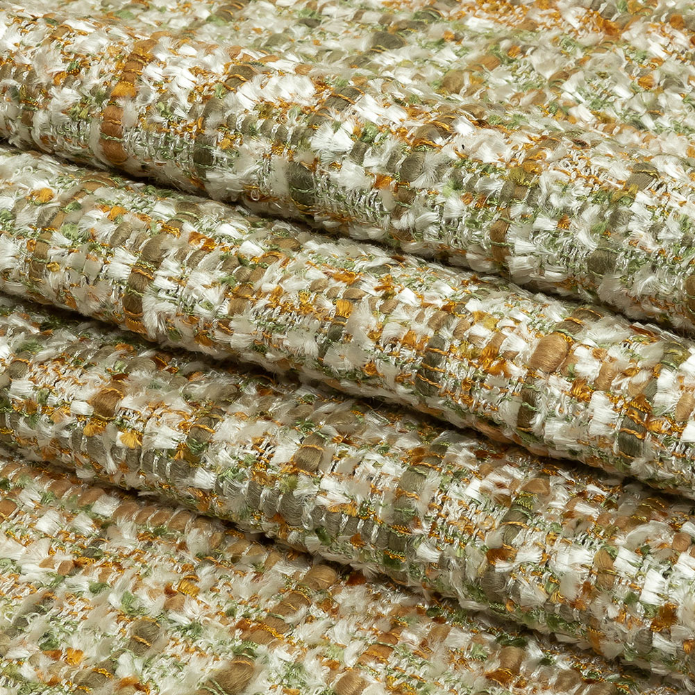 For a subtle mix of neutrals and alluring color, explore this Newcastle Green, Mustard and Silver Birch Viscose and Acrylic Chenille Tweed! Sage, white, gold, and greige are interwoven creating a slightly fuzzy, tactile hand.