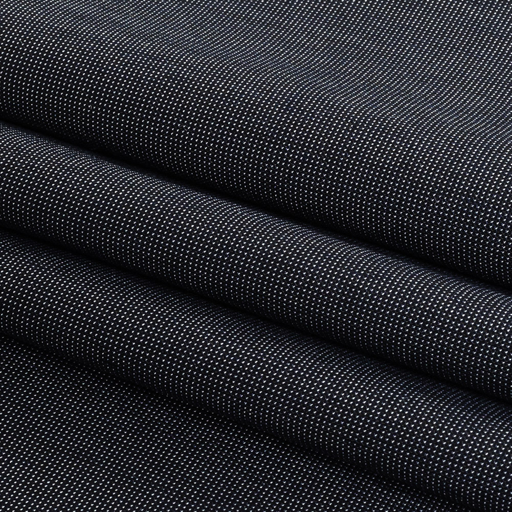 Add a spot of interest to your office wear with this Night Sky Pin Dot Stretch Polyester Suiting! A grid of minute light blue dots covers this deep blue suiting, which offers a crisp, yet soft hand and comfortable stretch through the weft.