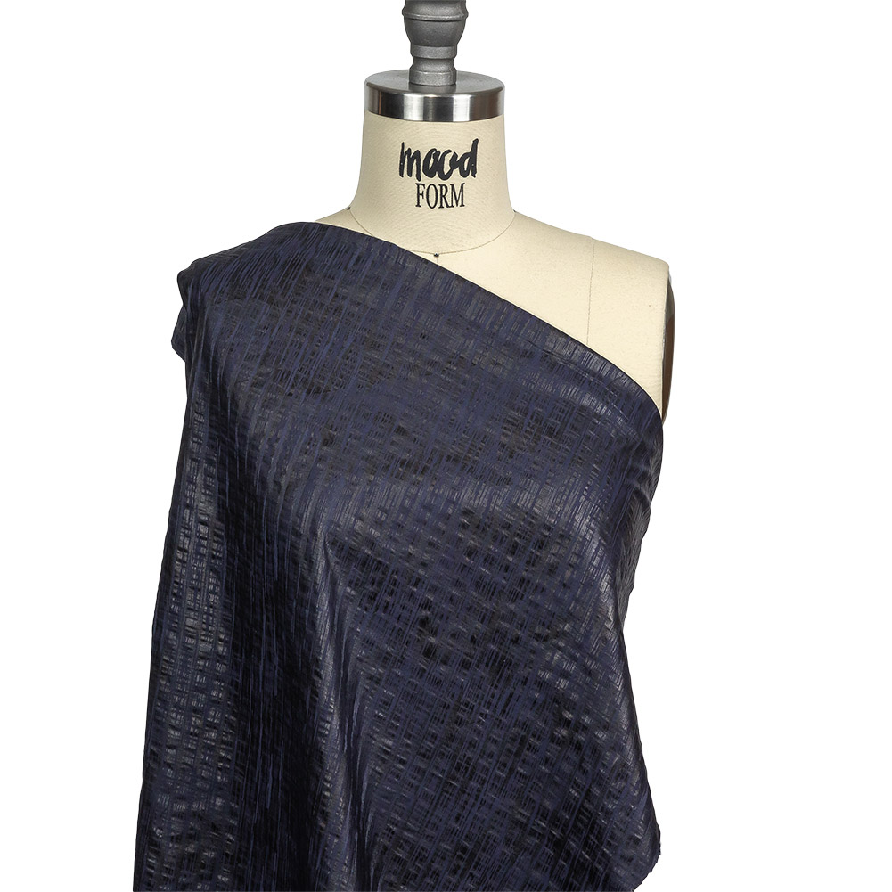 For a textural take on nightwear, we suggest a shirt made out of this Night Sky Striped Cotton and Polyester Dobby featuring a Gunmetal Striated Foil Topcoat! An already textured cotton dobby is overlaid with an abstractly patterned lamination, providing a striated, charcoal and navy design. Crisp and structured with a smooth hand, try button-down shirts and shirt dresses, balloon-sleeved blouses, or even sci-fi-inspired cosplay. Translucent, a lining can be added when additional structure is desired.