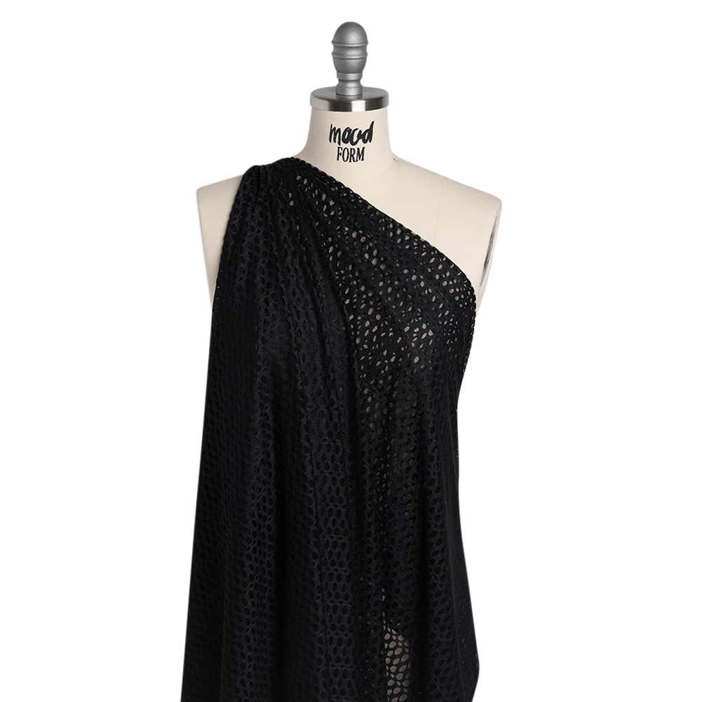 Let the moonlight in through the open weave of this Black Dotted Stripes Nylon Raschel Mesh Lace—featuring a soft, slightly tactile hand and airy, fluid drape.Suggested Projects: Shirts, Skirts, Dresses, LingerieContent: 100% NylonStretch: NoneOpacity: SheerOpaque stripes ripple across this raschel mesh lace, creating a rhythmic, dotted motif that dances between transparency and texture. With a soft, slightly tactile hand and an airy, fluid drape, this lace lends itself to ethereal silhouettes and dreamy eveningwear. Picture waterfall skirts that move like mist, fluttering blouses, elegant gown overlays, breezy button-ups shirts, or delicate lingerie. Naturally sheer, it invites creative layering or a lining for desired coverage.