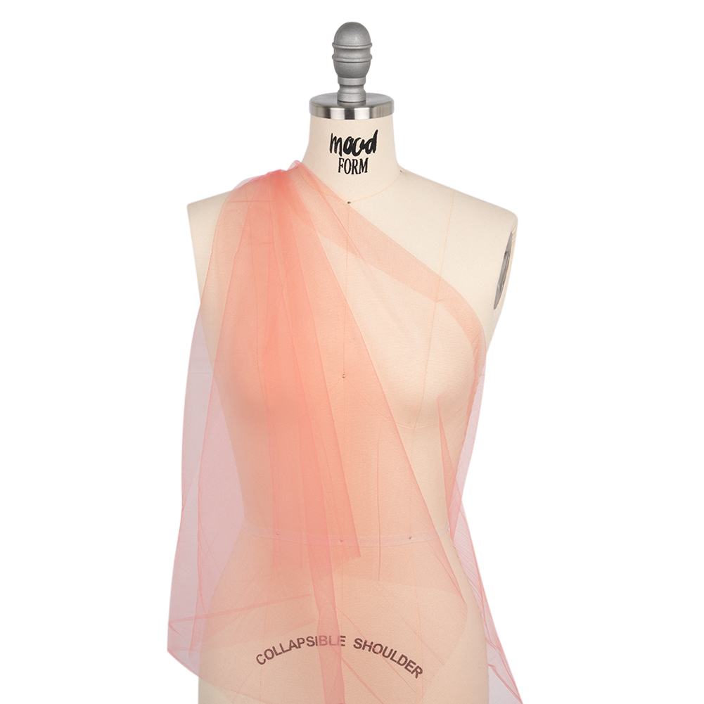 This Coral Nylon Tulle is shore to stun. With a 54-inch width, this tulle also boasts a semi-structured drape and mechanical give through the weft.Suggested Projects: Veils, Dresses, Skirts, TrimsContent: 100% NylonStretch: Weftwise Mechanical GiveOpacity: SheerThe tropics await you with this coral pink tulle. Add volume, flair, or elaborate design details to any garment or accessory using this phenomenal nylon tulle! For those who are unfamiliar with tulle fabric in general, it is a fine, often starched, net fabric used for tutus, veils, dresses, trims, etc. This tulle in particular is softer and thinner than most other tulles fabrics. If a soft tulle matches your design requirements, check out the 50 different extraordinary colors we carry it in!