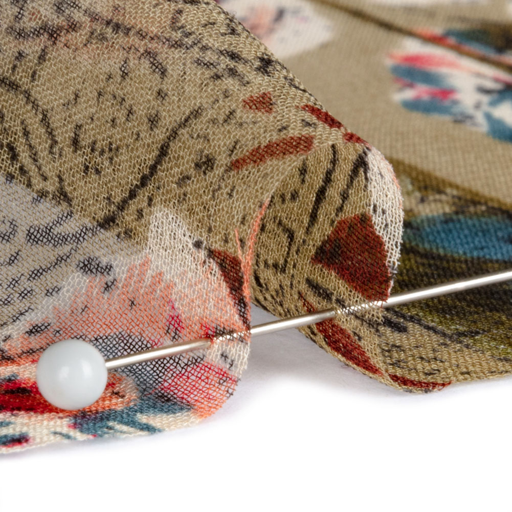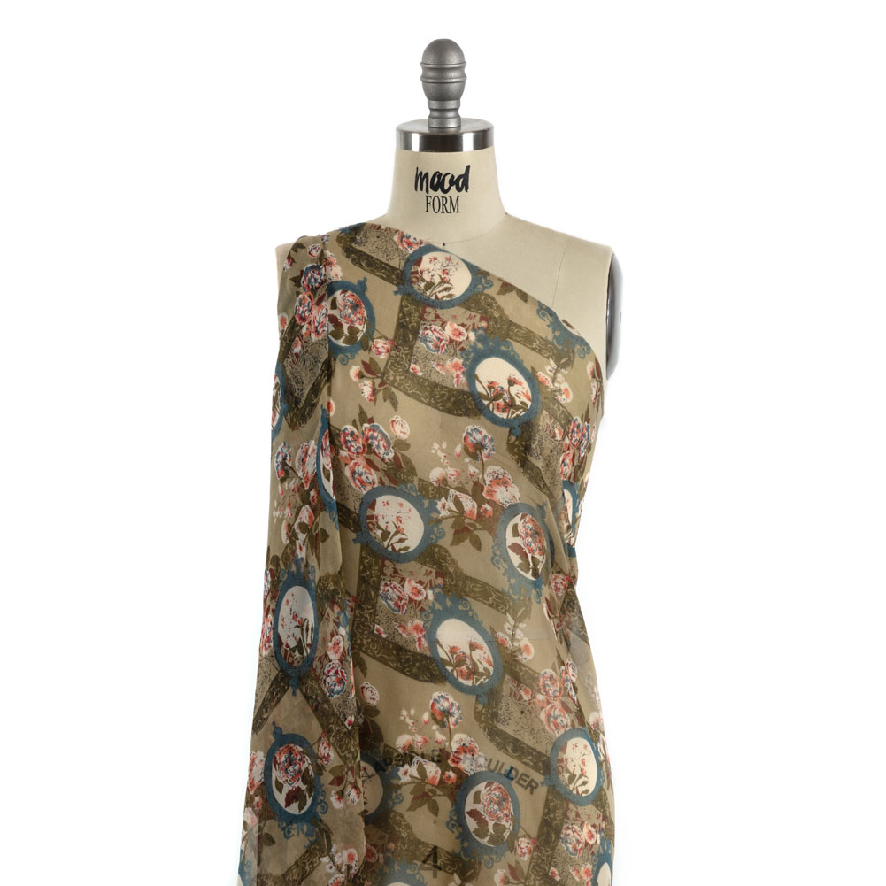 The old mansion on the hill, covered in moss and swinging vines, holds antique treasures within its rose-scented rooms. In its open window, this Olive, Blue and Pink Flowers and Frames Silk Chiffon flutters in the gentle, English countryside breeze. Ornate frames and sprawling looking glasses cover a sage green wall, decorated with fragrant, pink roses—beautiful yet unruly. Evocative of the elegant writings of Austen and Brontë, the effortless drape brings a romantic allure to long skirts and evening dresses. With or without a lining, depending on your desire for increased opacity, the grainy hand introduces texture to peasant blouses, sheer puffed sleeves, and more!