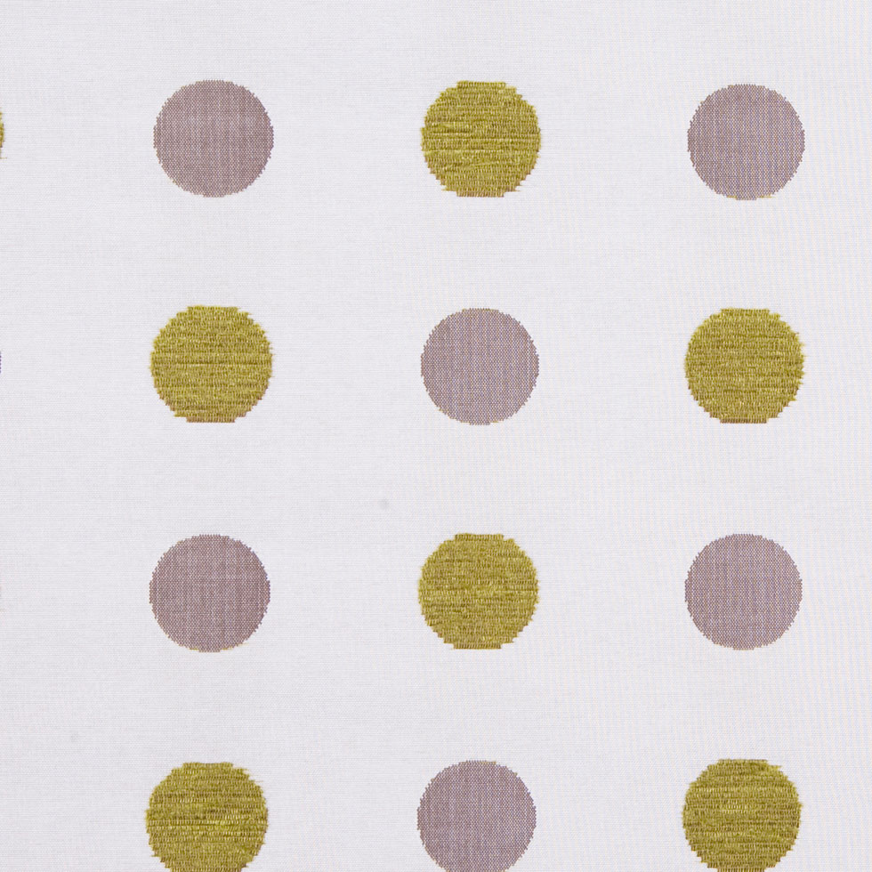 This is a cream polyester with olive green chenille and iridescent brown Polka Dots. Great for drapery.