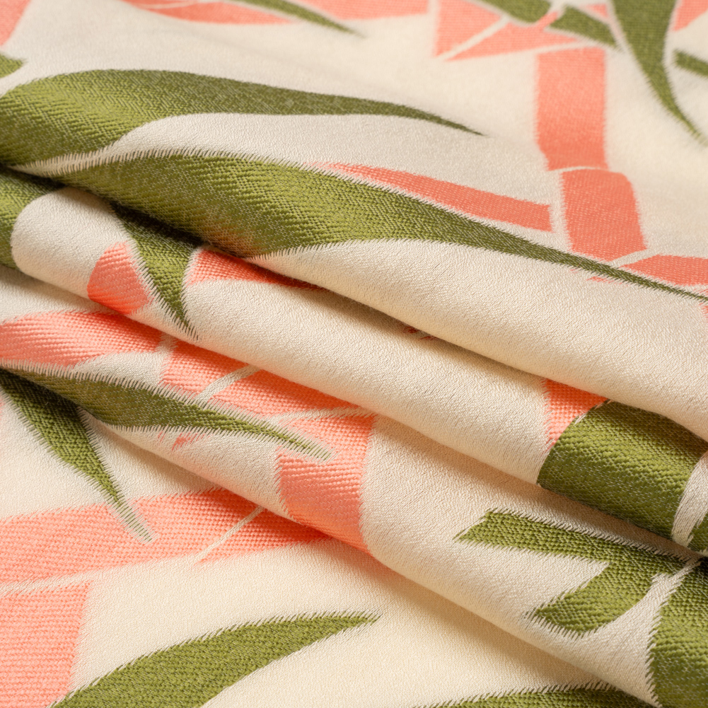 The peaceful forest of this Olive, Peachy Pink and Beige Bamboo Lattice Lightweight Polyester and Viscose Luxury Brocade brings a sense of ease to your formal garments. Pink bamboo shoots cross in the cream background as olive green trees grow upfront. While the colored sections add a slight texture variation to the face, the hand is overall sleek and cool. This lightweight, lustrous brocade falls with an easy drape, conjuring images of semi-structured silhouettes and long, flowing garments. Create structured blazers, handkerchief skirts, perfectly tailored gowns, and more! As this fabric is slightly translucent, we suggest lining it with our silk habotai linings for added opacity and luxury!