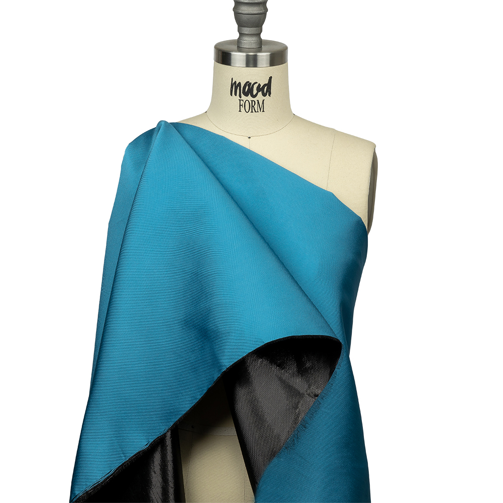 Fly to new fashionable heights like a little blue jay with this Olwyn Metallic Black and Blue Double Faced Luxury Mikado! Two equally fabulous hues create a stunning reversible fabric featuring a smooth luminous ocean blue face and a crisp metallic black reverse. With a voluminous, malleable drape and without stretch, craft structured plunge-neck gowns, A-line skirts, elegant event dresses, and evening jackets. Opaque, the addition of a lining is not required, especially when attempting to highlight both faces of this material.