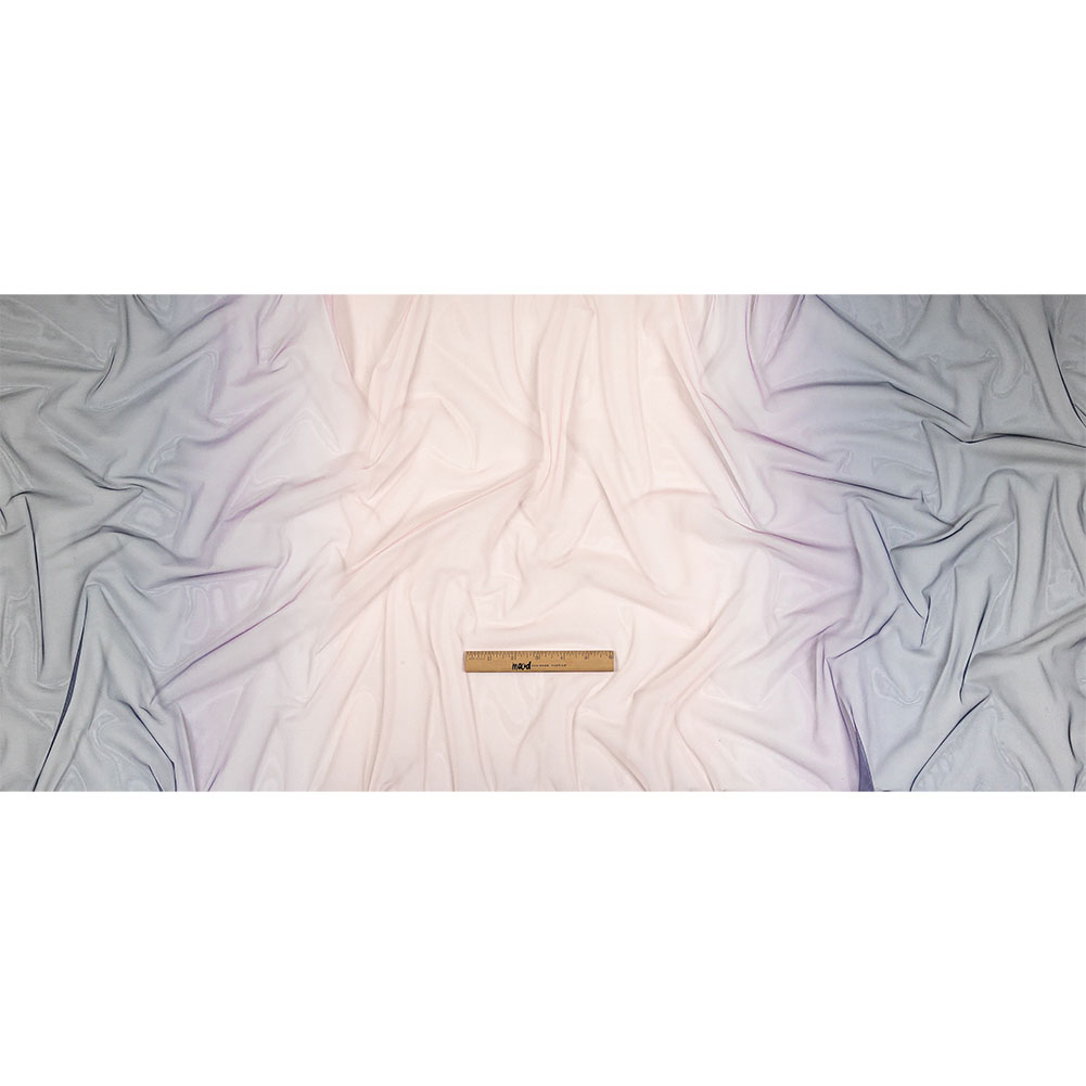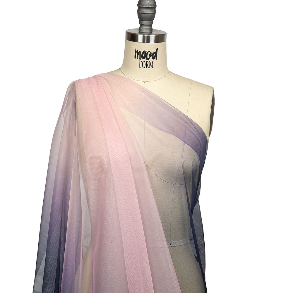 Soft and bold at the same time, this chic Navy and Blush Ombre Shadow Tulle is a wardrobe must-have! Featuring a fluid and airy drape, soft hand, and gentle luster.Suggested Projects: Dresses, Skirts, Tutus, OverlaysContent: 100% PolyesterStretch: Slight Mechanical GiveOpacity: SheerA mirrored gradient from dark navy through purple to pale pink and back again plays with a gentle luster over a delightfully soft tulle. Fluid and airy in drape with a slight give, create dresses with puffed sleeves and gathered details, voluminous tutu skirts, and fabulous illusion necklines. Entirely sheer, a lining is necessary where opacity is desired.