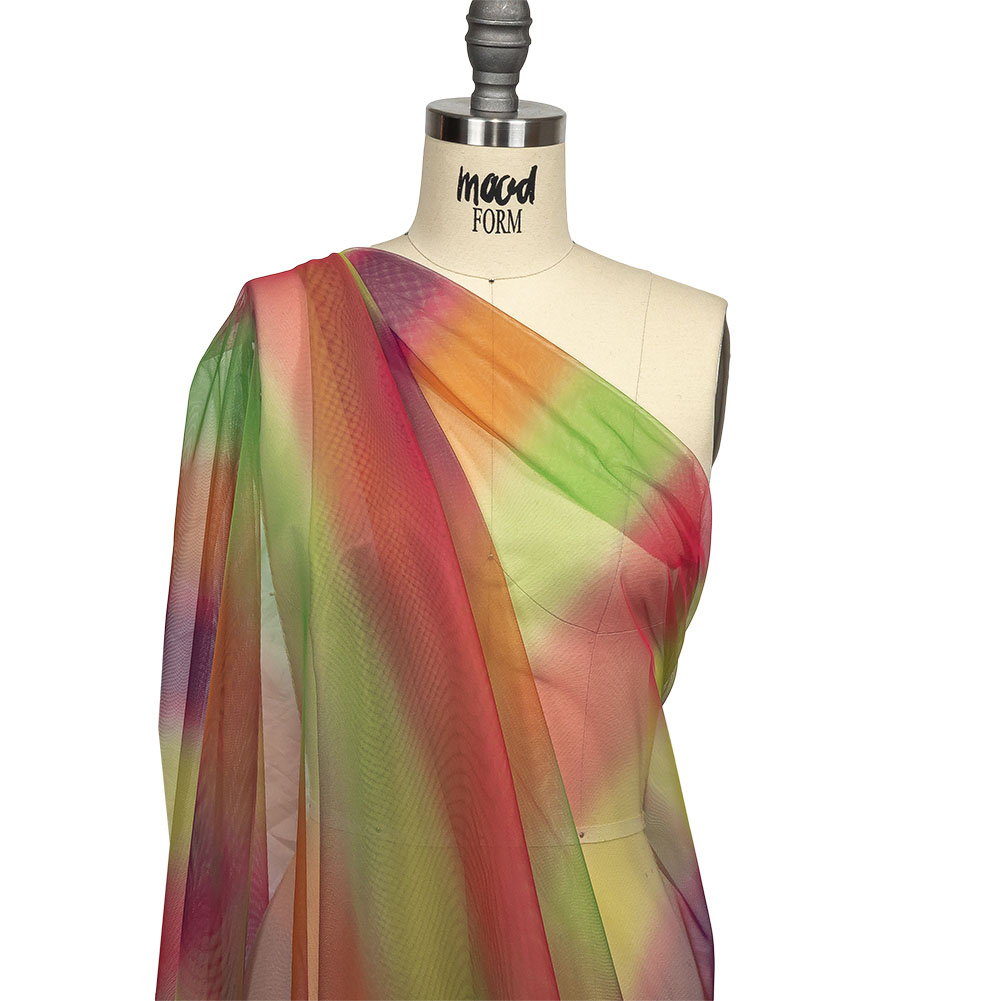 Enjoy a juicy fruit explosion with this Yellow, Green and Pink Ombre Stripes Shadow Tulle! Featuring a fluid and airy drape, soft hand, and gentle luster.