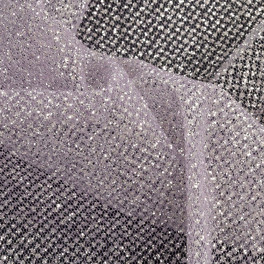 Play with purple using this Lilac and White Ombre Tulle with Metallic Platinum Glitter! Featuring a coarse hand and crisp drape.