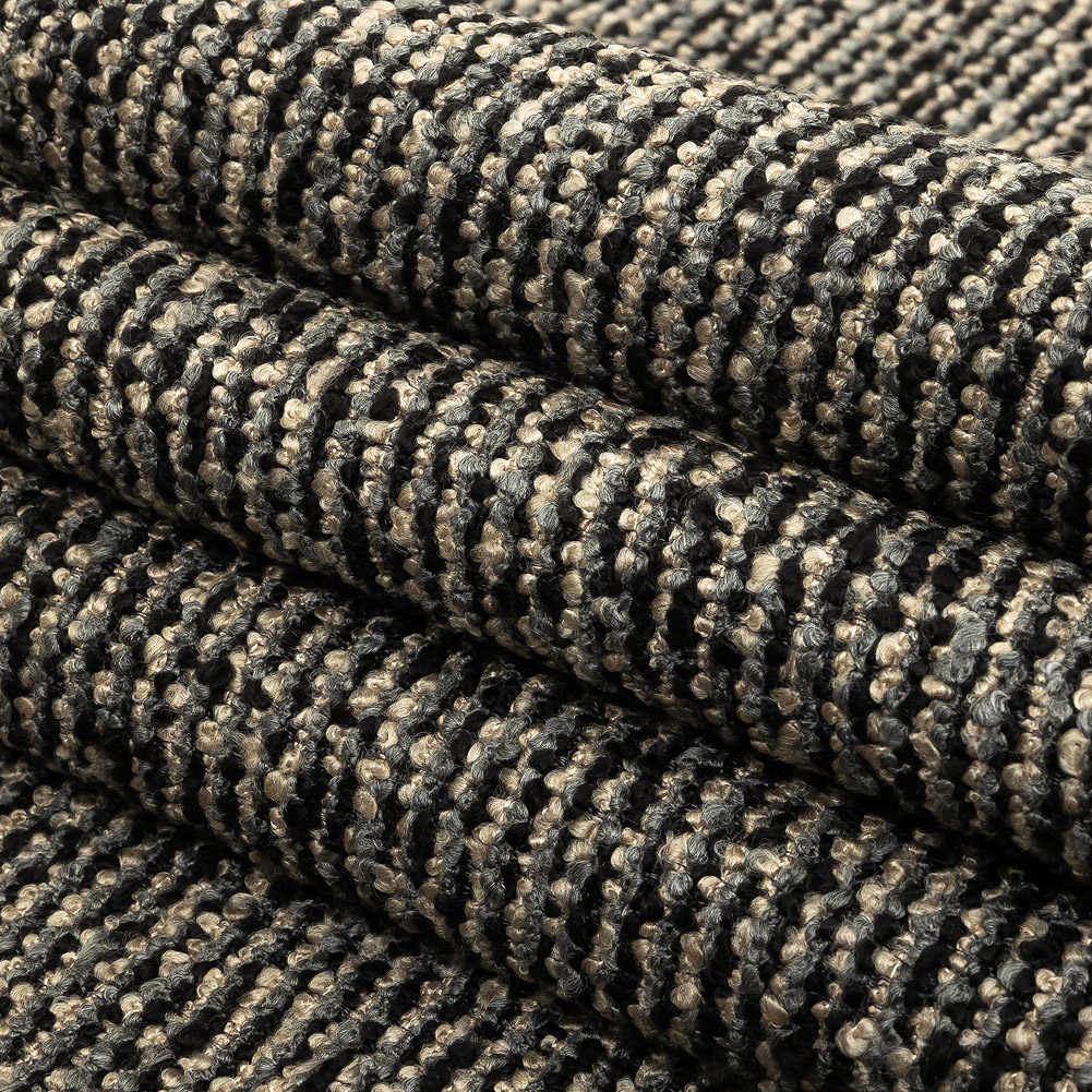 As if coming to us straight from Jay Gatsby's mansion, our Onyx Striped Acrylic Upholstery Boucle is made for Art Deco luxury! Stripes of boucled fibers run across the face, switching from black, to gray, to taupe, all providing a soft pop of texture. Of a heavier weight, this structured fabric is ideal for upholstery applications, including statement ottomans to rest your feet on after a long day, or stand-out benches sure to get guests talking. Opaque, a lining is not needed for opacity.