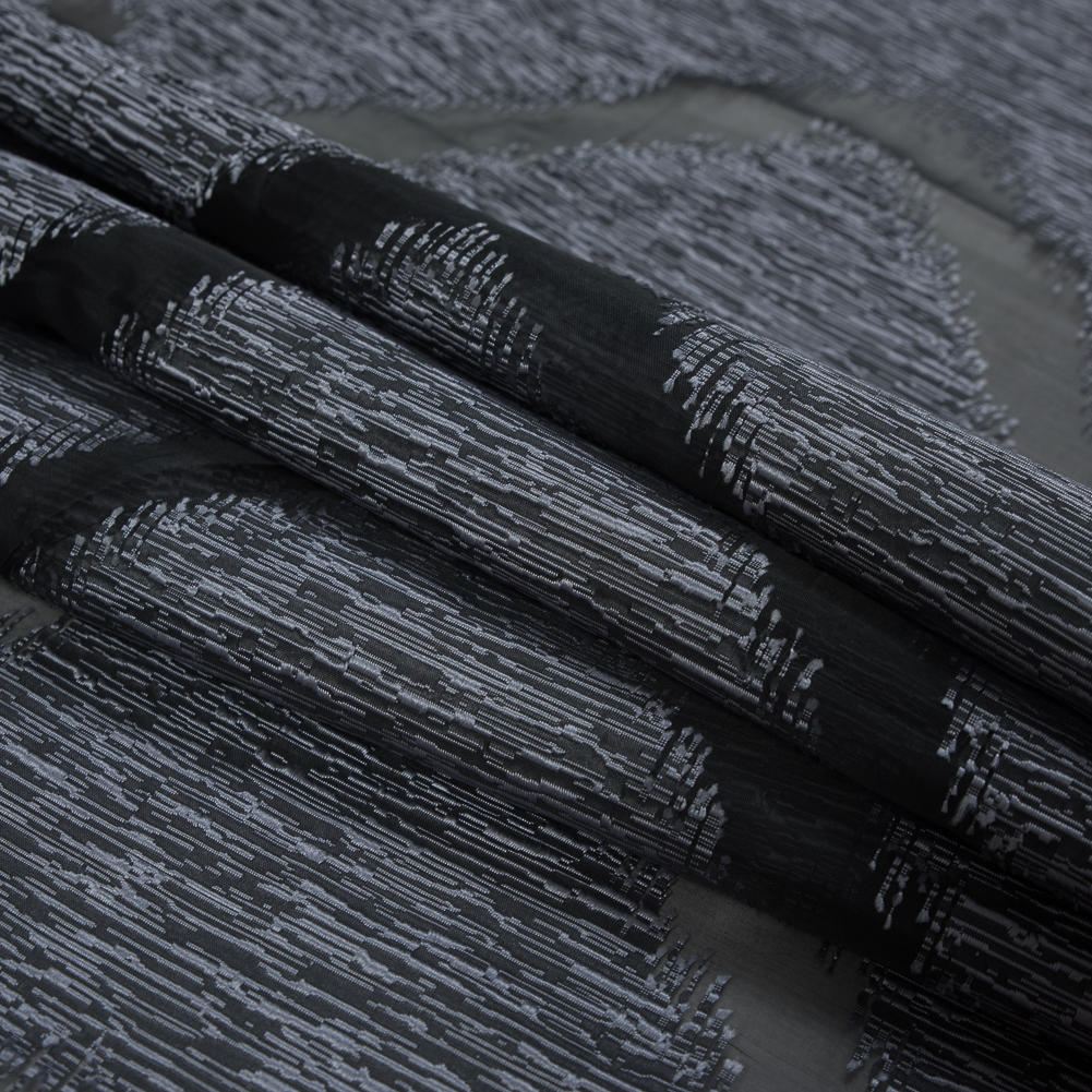 Looking for some edge? Check out this Gray Chevron Organza Burnout Jacquard. The soft organza bursts with texture as a jacquard zig-zag stripes across it. Organza excels in creating evening attire and avant-garde silhouettes as it presents a voluminous drape. Thin and lightweight, use the sheer woven to create cocktail dresses, full skirts and one-of-a-kind bomber jackets. Insert a lining for more opacity, or use it as a sheer panel!