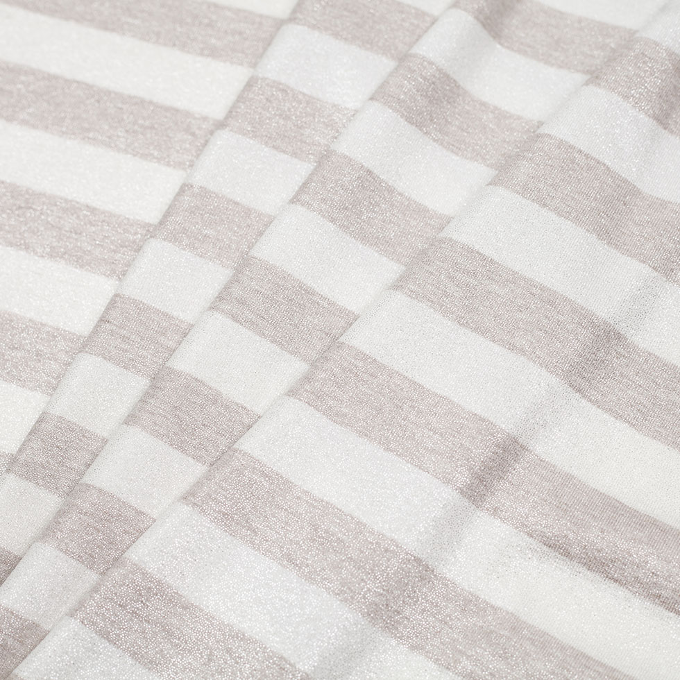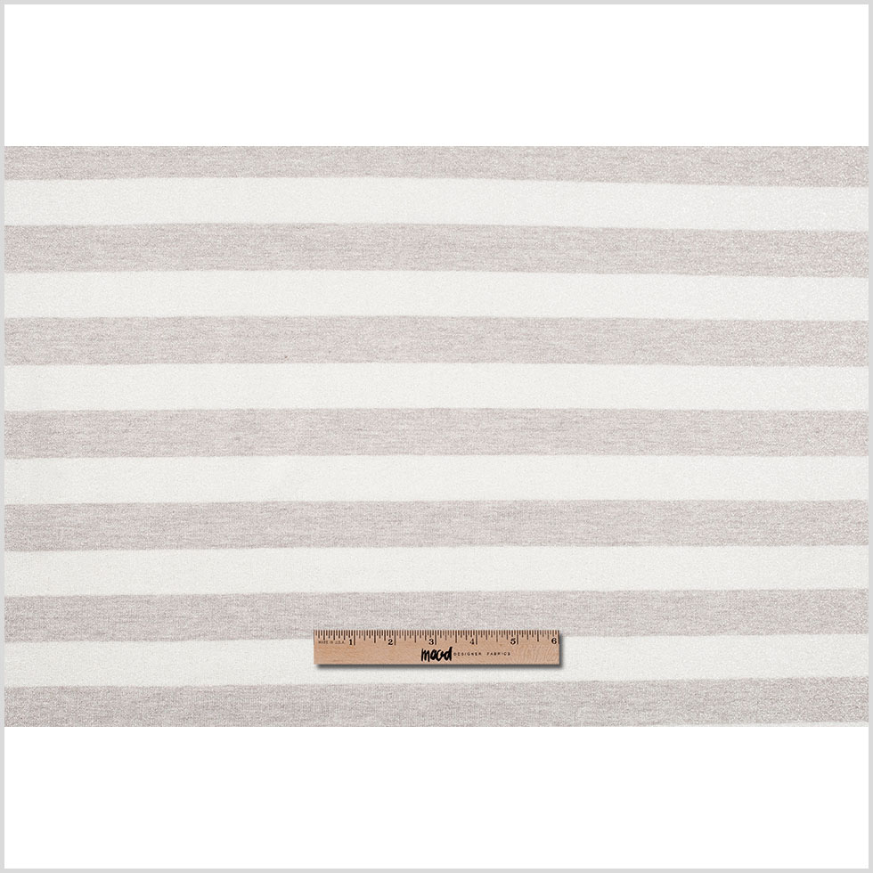 Bring a little shimmer to your life! Mood presents this laminated metallic flecks, striped cotton jersey just in time for summer maxi skirts and dresses. The taupe stripes measure .875" and the cream stripes come in at .875" comprising the vertical repeat; note the stripes are horizontal. With four-way stretch, this knit will see you through the summer month with ease.