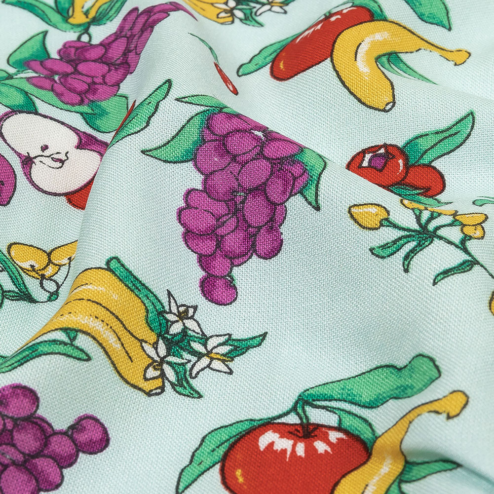 If you think fruit salad is yummy yummy, you should see the eye candy that's this Pale Blue, Green and Yellow Fruit Viscose Batiste! Bright primary colored fruits—apples, bananas, grapes, and berries—decorate the sweet aqua ground of this batiste with viscose's standout supple drape. Soft and cool, it contains no stretch, but still provides a wide range of potential uses. Consider bouncy summer dresses, gathered skirts, and flowing tanks. Mostly opaque, a lining is only necessary where additional structure is desired.
