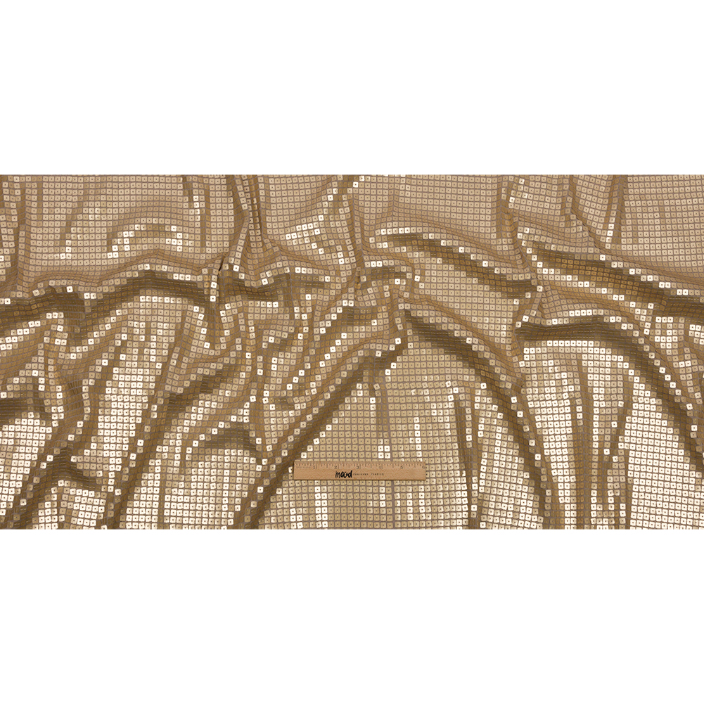 Use this Pale Gold Sequins on Polyester and Rayon Jersey for all your formal wear needs and you'll be golden for life! Mash together a fabulous polyester and rayon jersey with evenly placed pale gold square sequins and this compelling creation is the immediate result! Although this sequined jersey has the ability to stretch along the crosswise grain, we highly recommend not utilizing its stretch to avoid unwanted bunching of the sequins themselves. Such a material would be great when whipping up stylish tops and sassy dresses. Note that this material is translucent and may require a lining depending on the applications.